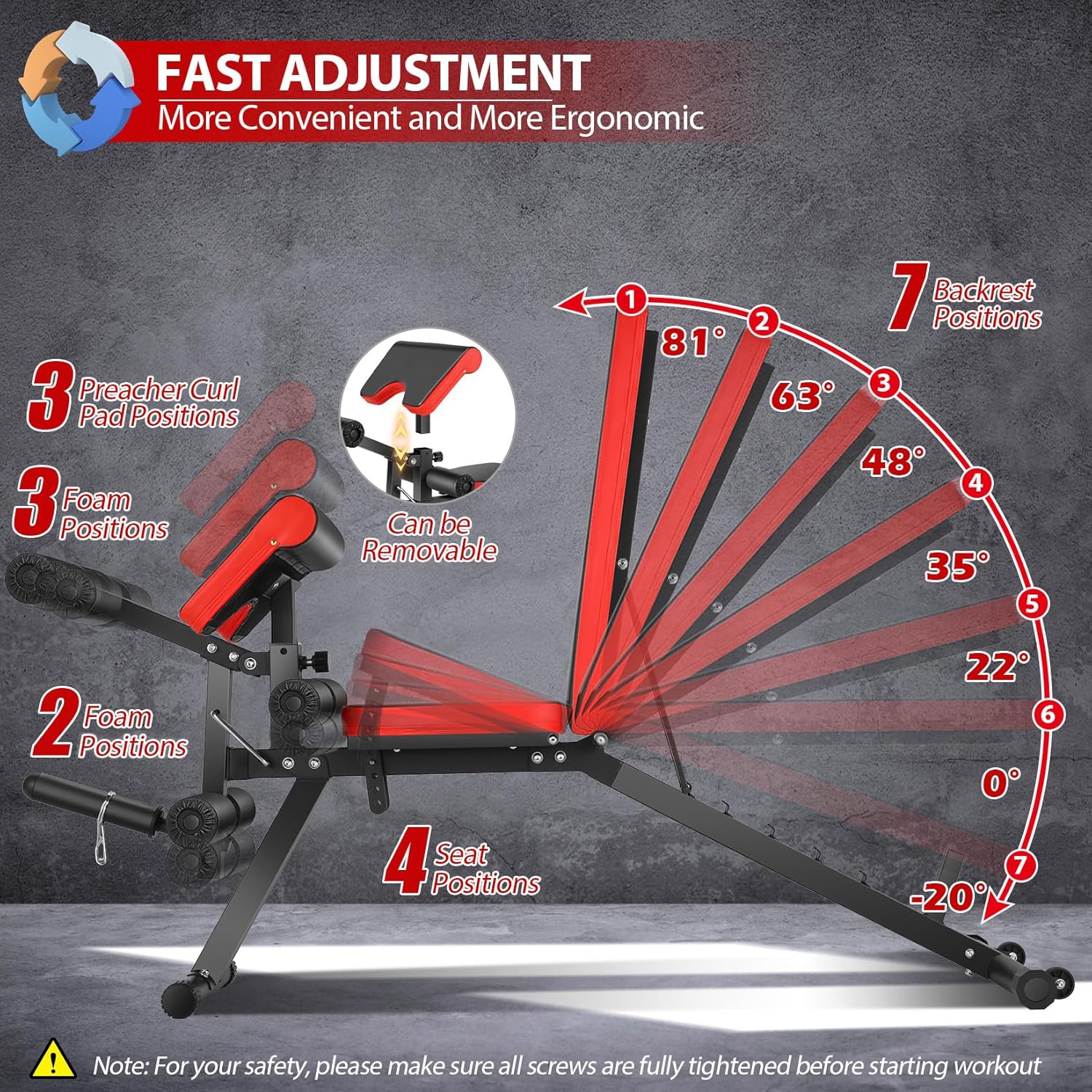 - 【Detachable Preacher Pad】The preacher pad of this workout bench is detachable, allowing you to remove it during leg curls for better training efficiency.