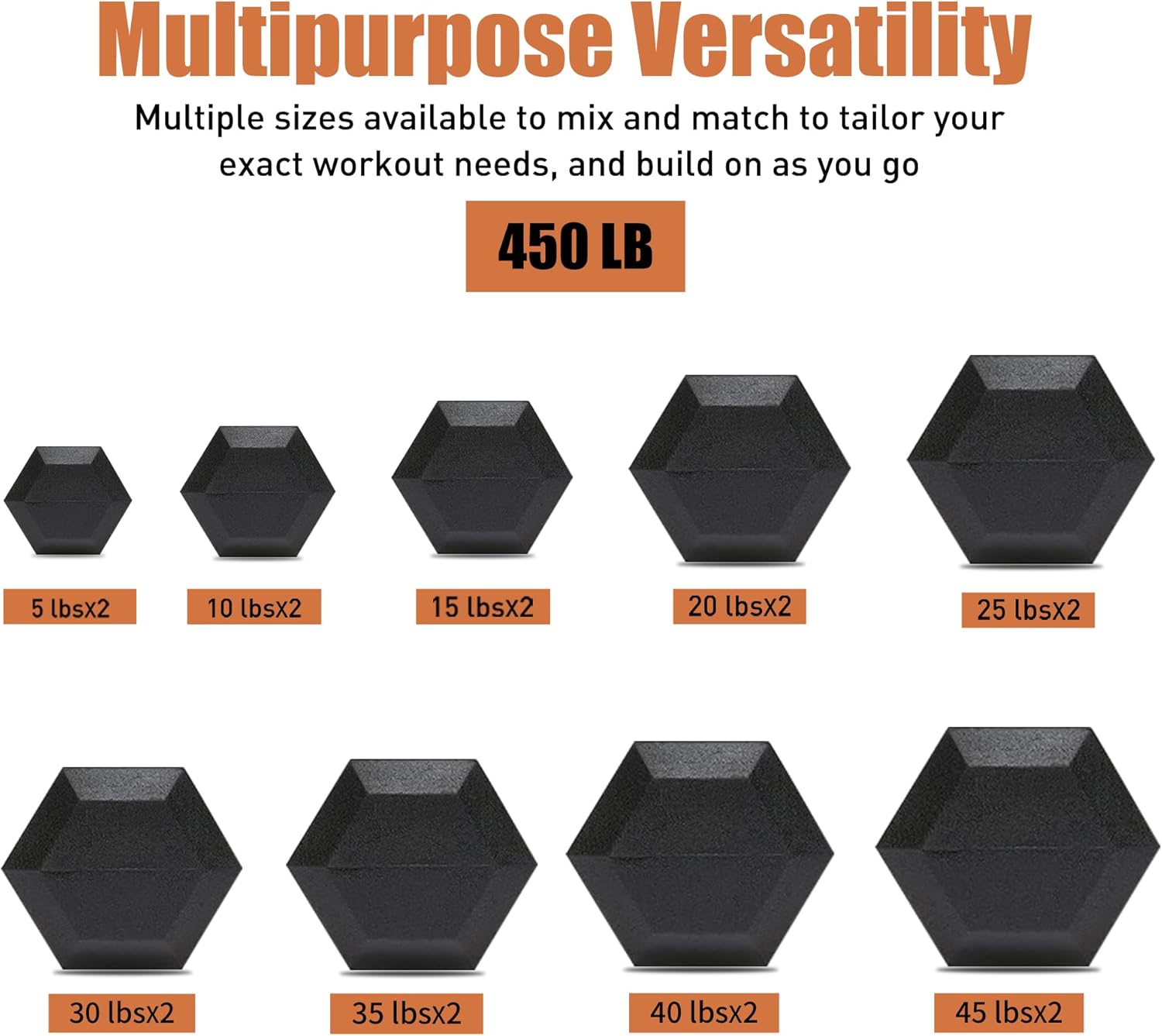 - Versatile Weight Dumbbell Sets: This 450lbs dumbbell set – a rubber hex dumbbells set with a home dumbbell rack – comes with a range of weights from 5LB, 10LB, 15LB, 20LB, 25LB, 30LB, 40LB (including 5/45 dumbbell rack compatibility) and even a 5-45 barbell dumbbell rack-heavy duty adjustable 3 tier dumbbell storage rack. This rack of dumbbells includes 9 pairs, making it suitable for teenagers, adults, and women in gyms or home setups. The different specifications provide the right free weight for different fitness levels and exercises, whether you’re using the dumbbell hex set for strength training or pairing it with a dumbbell and kettlebell set for versatility.