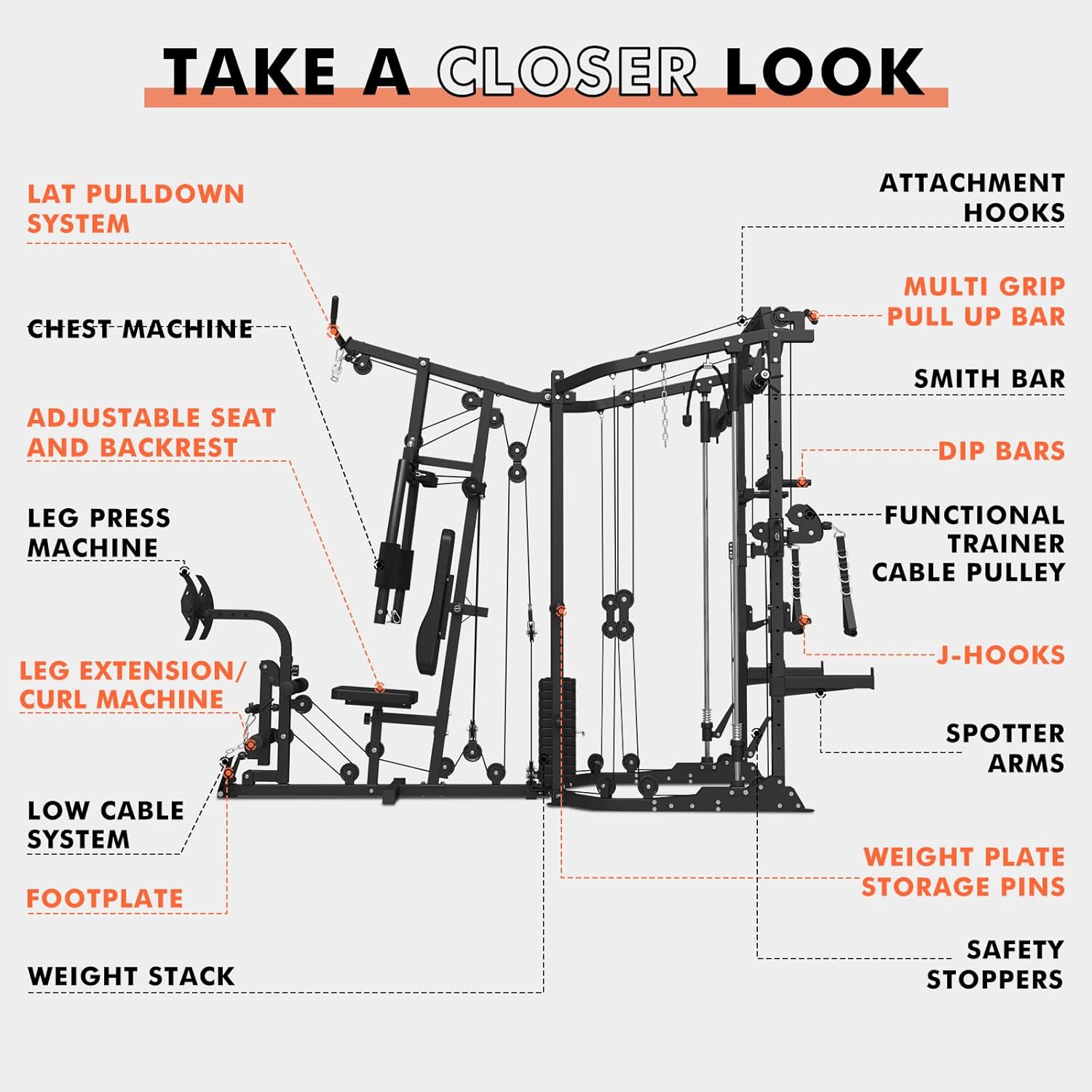 - [Dual-Sided All-in-One] Home gym equipment maximize your workout potential with our versatile dual-sided multi-function home gym station, combining a home gym system, smithΔ machine, power rack, and functional trainer into one comprehensive unit