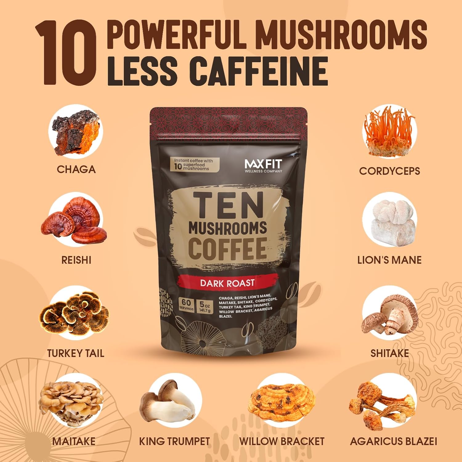- GOURMET TEN MUSHROOMS COFFEE BLEND - Dark Roast 100% Arabica instant coffee with 10 functional mushrooms. Experience our mushroom coffee blend, combining Chaga, Reishi, Lion's Mane, Cordyceps, Shiitake, Maitake, King Trumpet, Agaricus Blazei, Willow Bracket and Turkey Tail for delicious, energizing coffee for clean energy, mental focus, immune support and creativity.