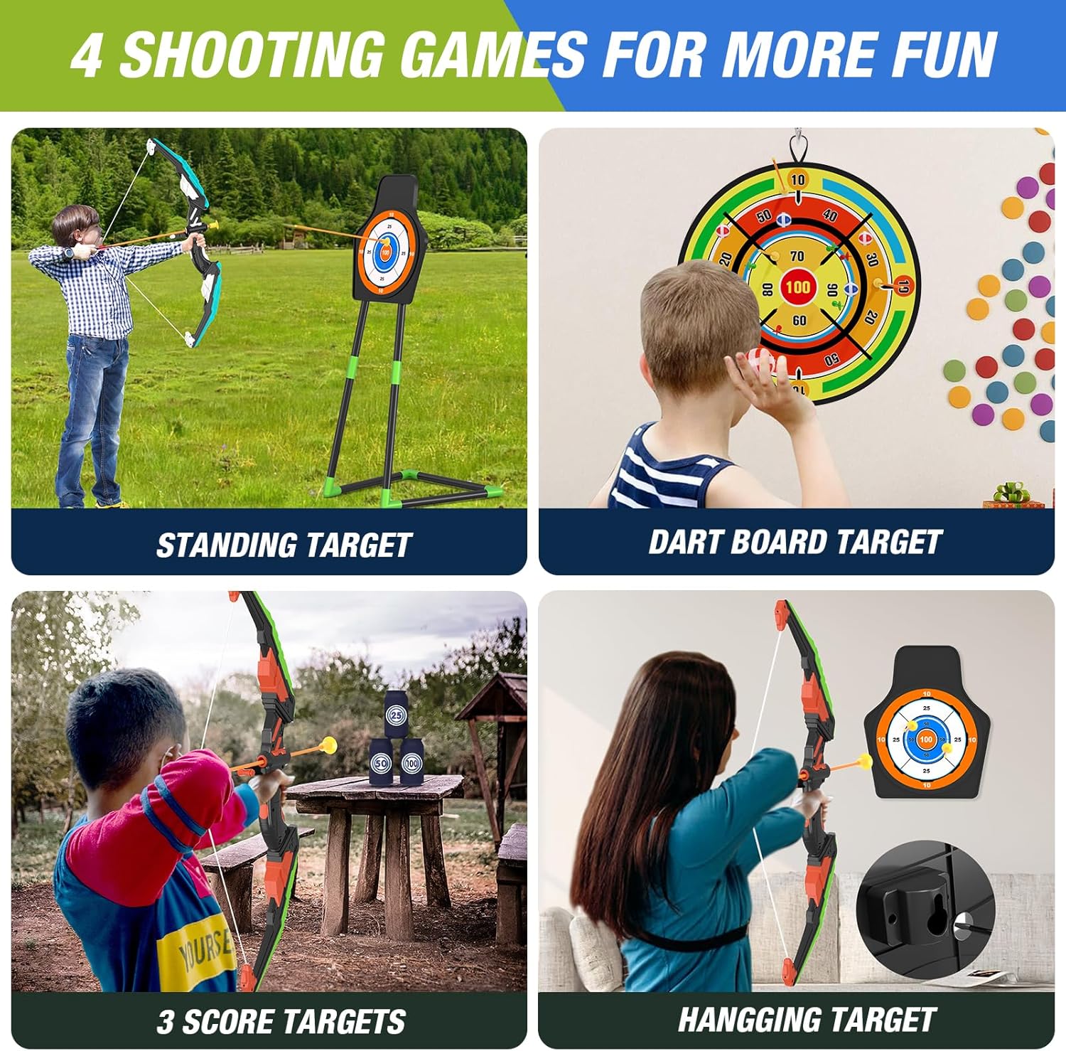 - [4 Different Types of Targets] -①Standing target. ②Dart board target. ③Wall-mounted target(detach from the standing target). ④6 Score Targets(from 25-50-100). Bring you more shooting fun! We come with clear instructions so you can easily assemble the height-adjustable standing target. A wall-mounted target and dart board can be hung on a wall or tree. Bow and arrow provide an endless fun and goal experience for kids!