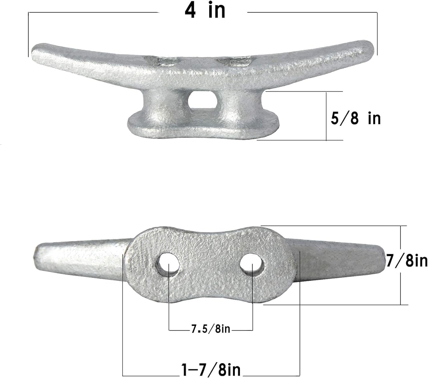 - 【Size&With Hardware】These metal boat dock cleat have a size of 4 inches in length and 1-1/8 inches in height, with a base measuring 1-7/8 inches x 7/8 inches. cleats for boats the mounting holes are spaced 7.5/8 inches center to center. The dock boat cleats come with hardware, including M5x1.57 inch stainless steel screws. galvanized boat cleats are compatible with a wide range of boat materials, easily installed to boat decks, docks, or other structures
