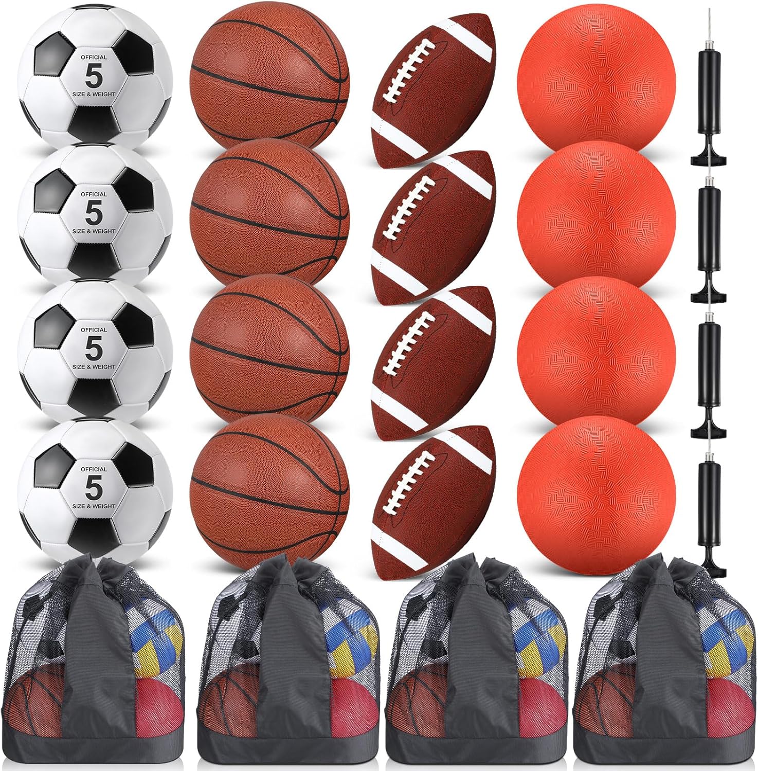 - What You Will Get: you will receive a sports equipment set, including 4 basketballs, 4 soccer balls, 4 footballs, 4 playground balls, 4 pumps and 4 sports equipment bags, enough quantity to meet your playing and replacement needs