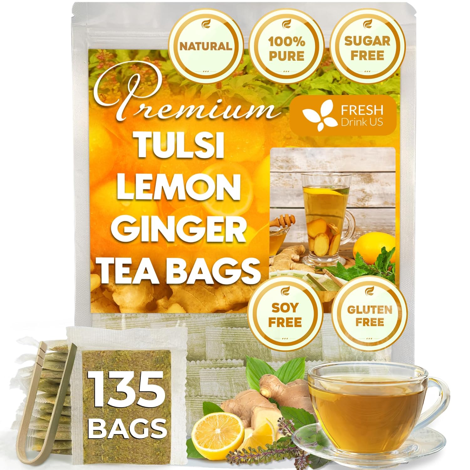 FreshDrinkUS, Premium 135 Tulsi Lemon Ginger Tea Bags, 100% Natural & Pure from Tulsi Holy Basil Leaves, Lemon and Ginger. Made with Natural Material Tea Bags. No Sugar, No Caffeine, Vegan.