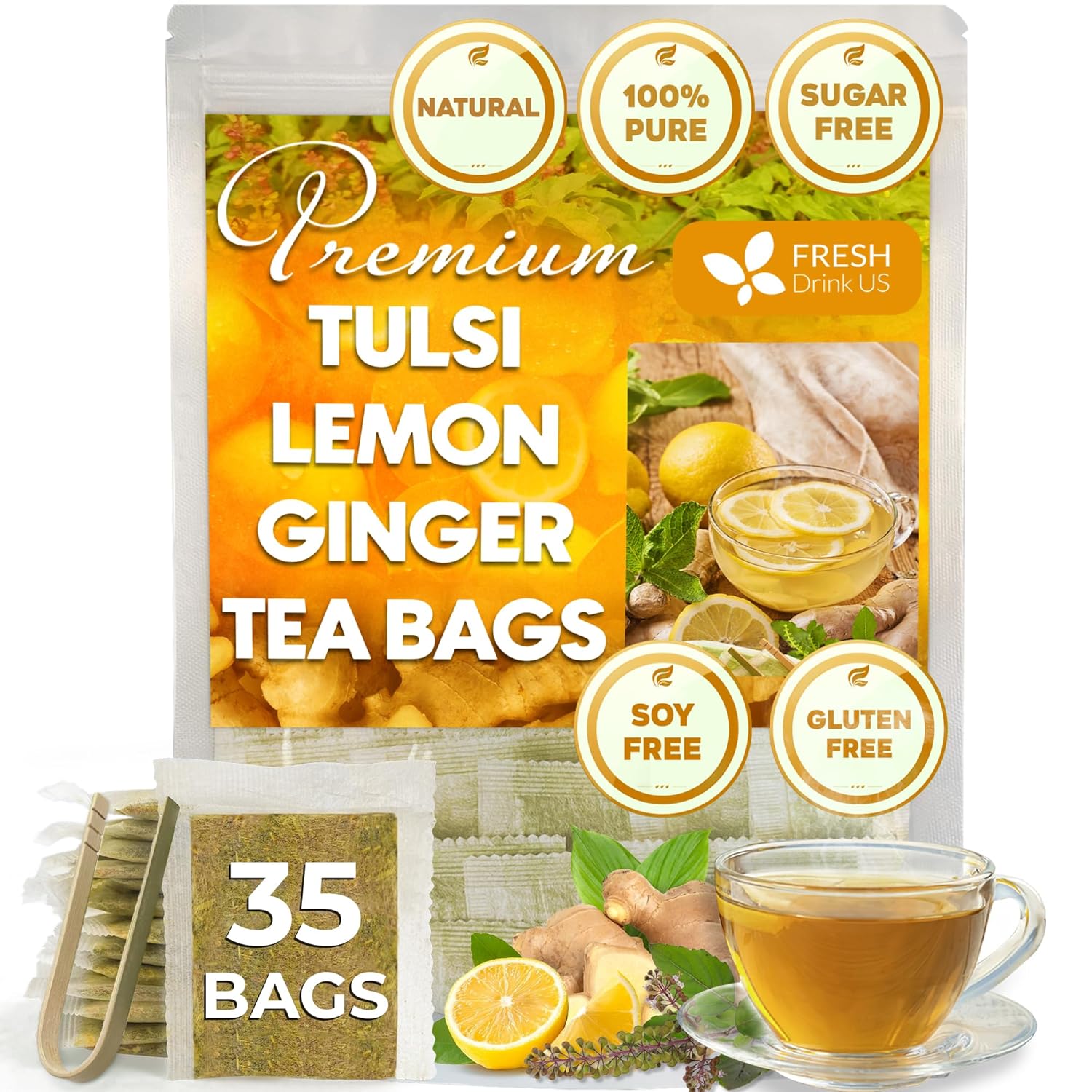 FreshDrinkUS, Premium 35 Tulsi Lemon Ginger Tea Bags, 100% Natural & Pure from Tulsi Holy Basil Leaves, Lemon and Ginger. Made with Natural Material Tea Bags. No Sugar, No Caffeine, Vegan.