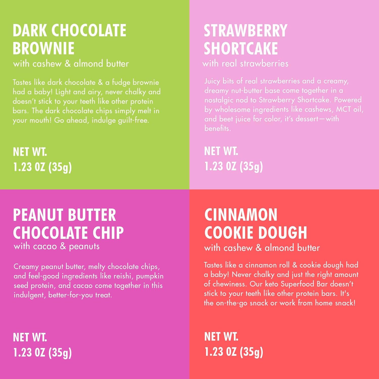 - โ VARIETY PACK: Want to try each of our bestselling superfood keto protein bars? Our Variety 12-pack gives you the best of both worlds: clean plant-based ingredients you trust, delicious flavors you crave!