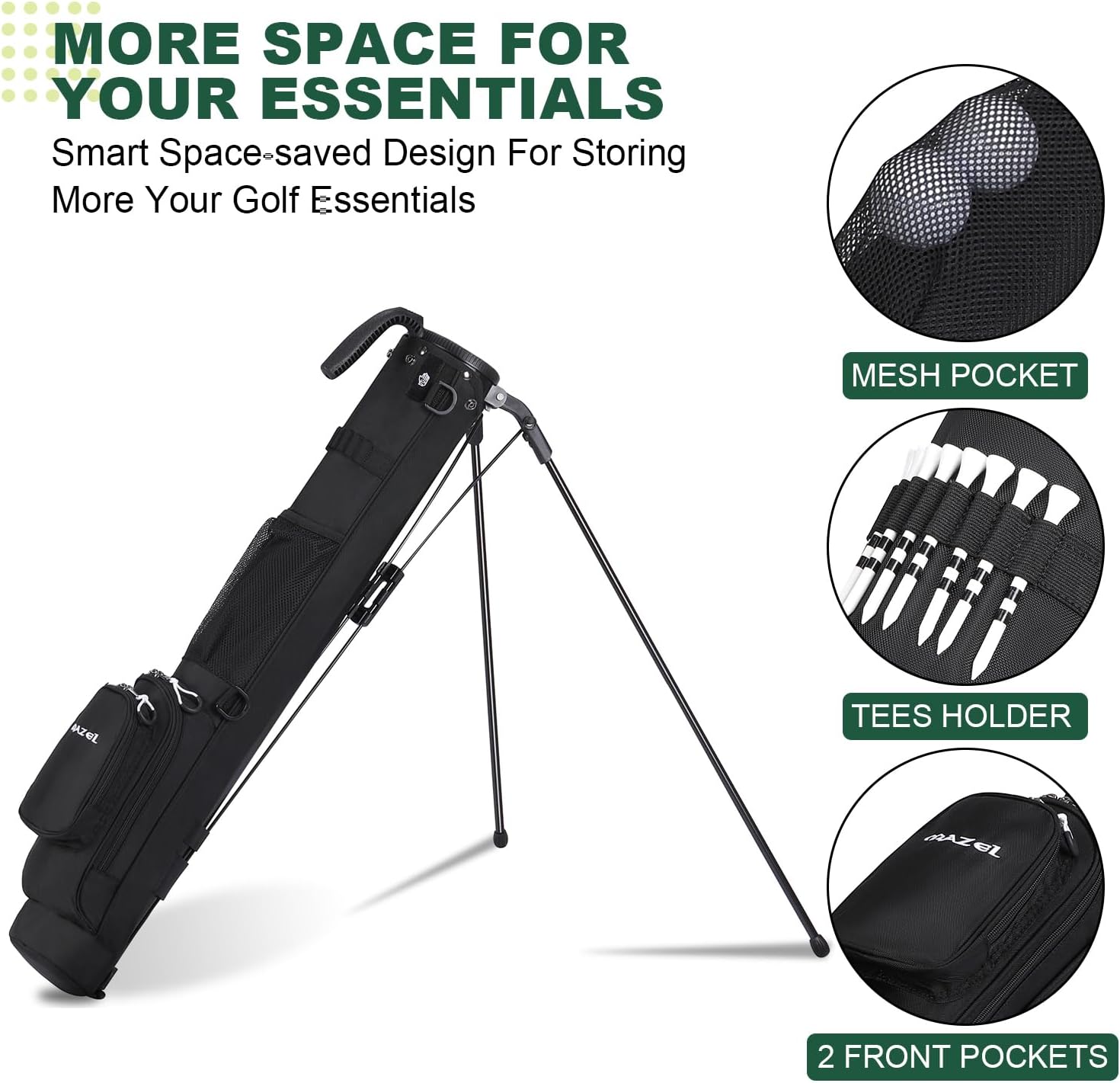 - LIGHTWEIGHT & PORTABLE: The golf stand bag weighs only 2.3lbs for easy portability,the top handle and adjustable shoulder strap offers you 2 ways to carry the golf bag,it's perfect for a day at the driving range, a few holes at an executive golf course, a Par 3 course!