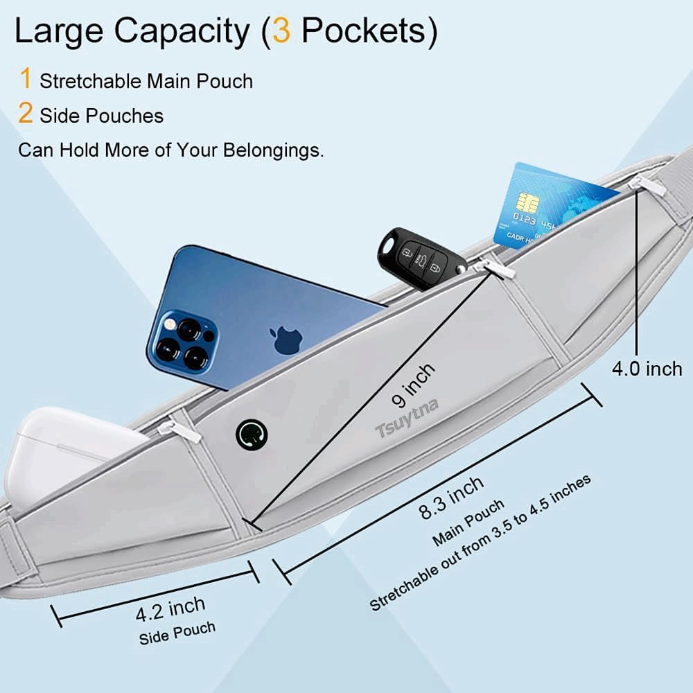 - WATER-RESISTANT PROTECTION: TSUYTNA Slim Phone running belt Durable TPU-lined pockets and sealed zippers shield phones (fits iPhone 15 Pro Max/Samsung S24), keys, and cards from sweat, rain, and splashes—keep essentials dry without bulk.