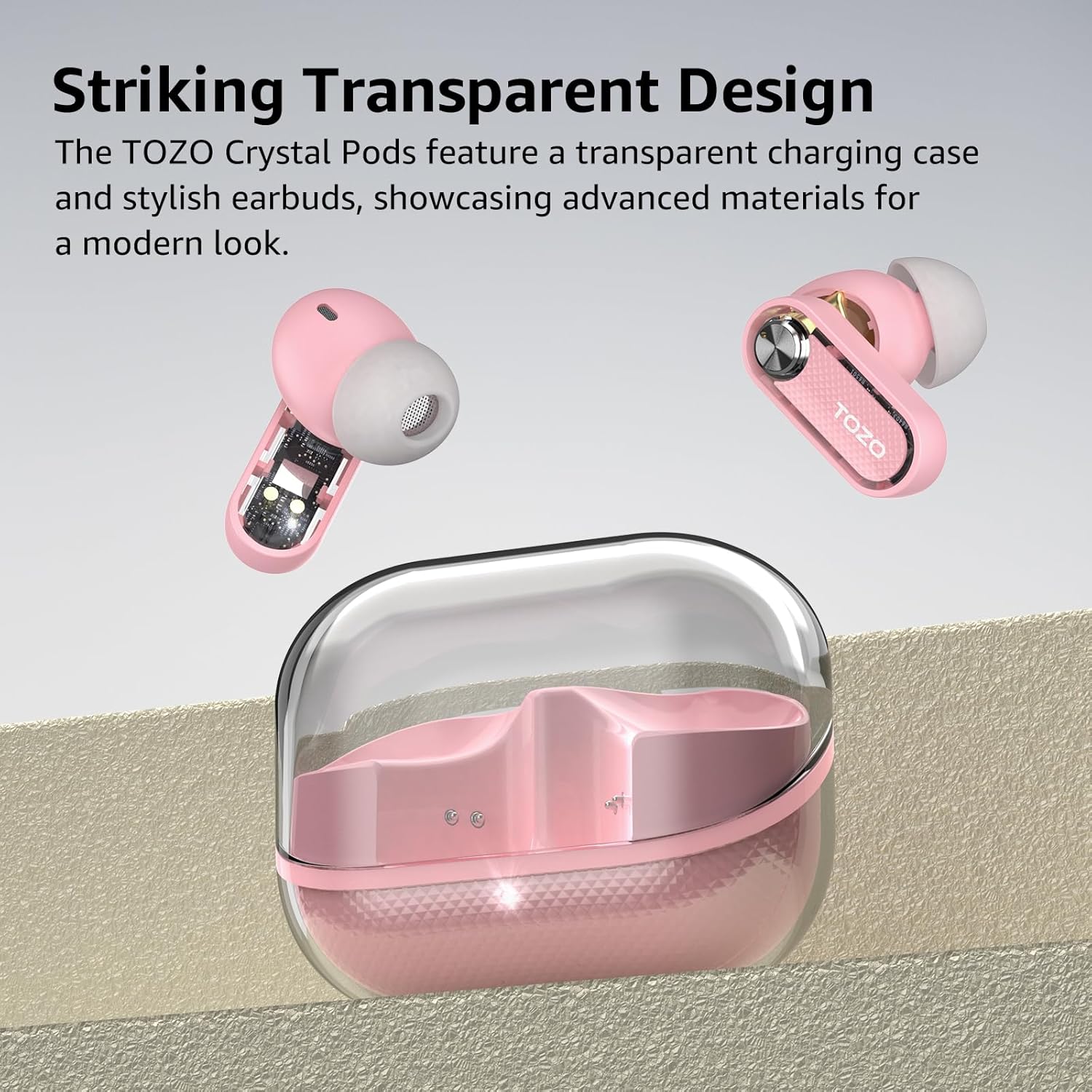 - [Sleek Transparent Design] TOZO Crystal Pods features a stylish transparent charging case and earbuds design, combining modern aesthetics with advanced technology, making this bluetooth earbuds a perfect accessory for on-the-go use.