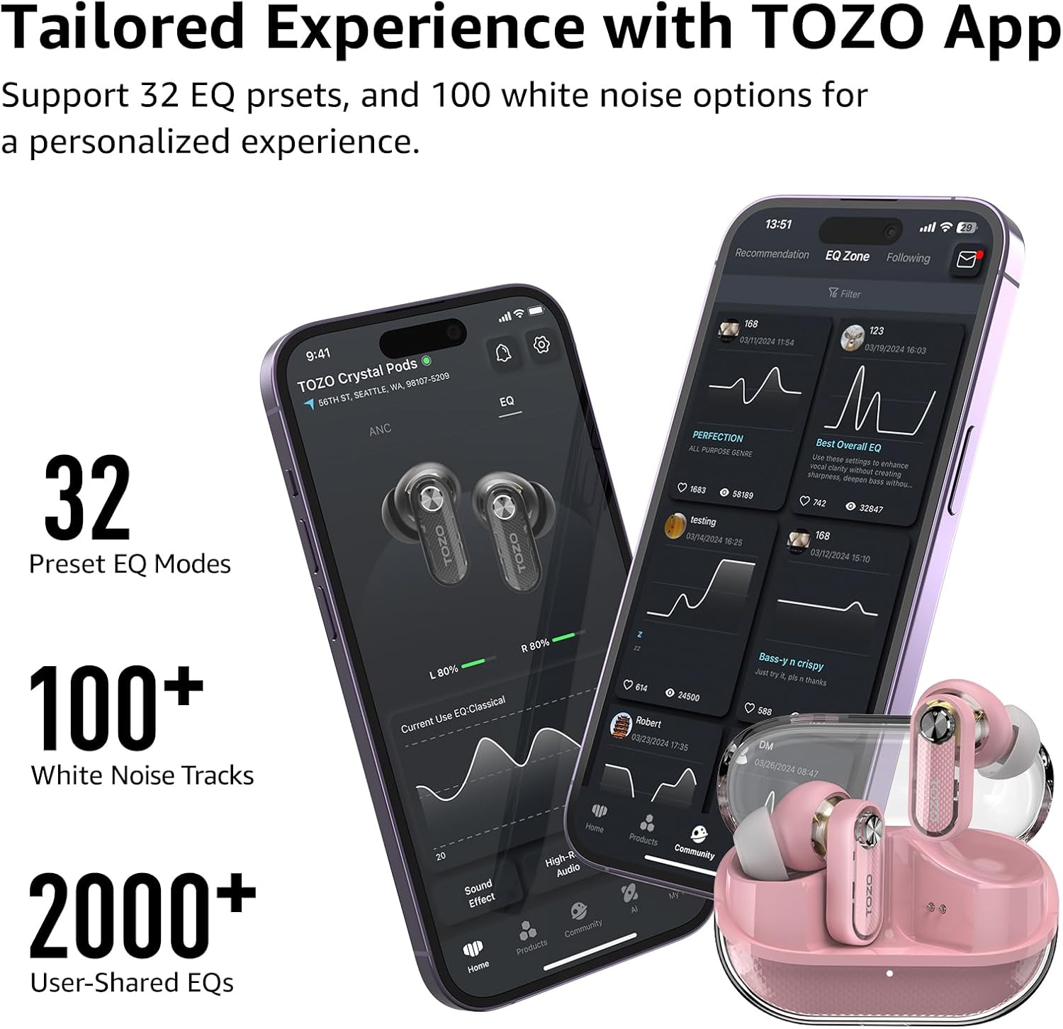 - [Personalized Listening Experience] Use the TOZO app to customize the controls and choose from 32 EQ presets. You can also share the joy of custom equalizers with over 2,000 audiophiles from around the world in the βEQ Zoneβ.