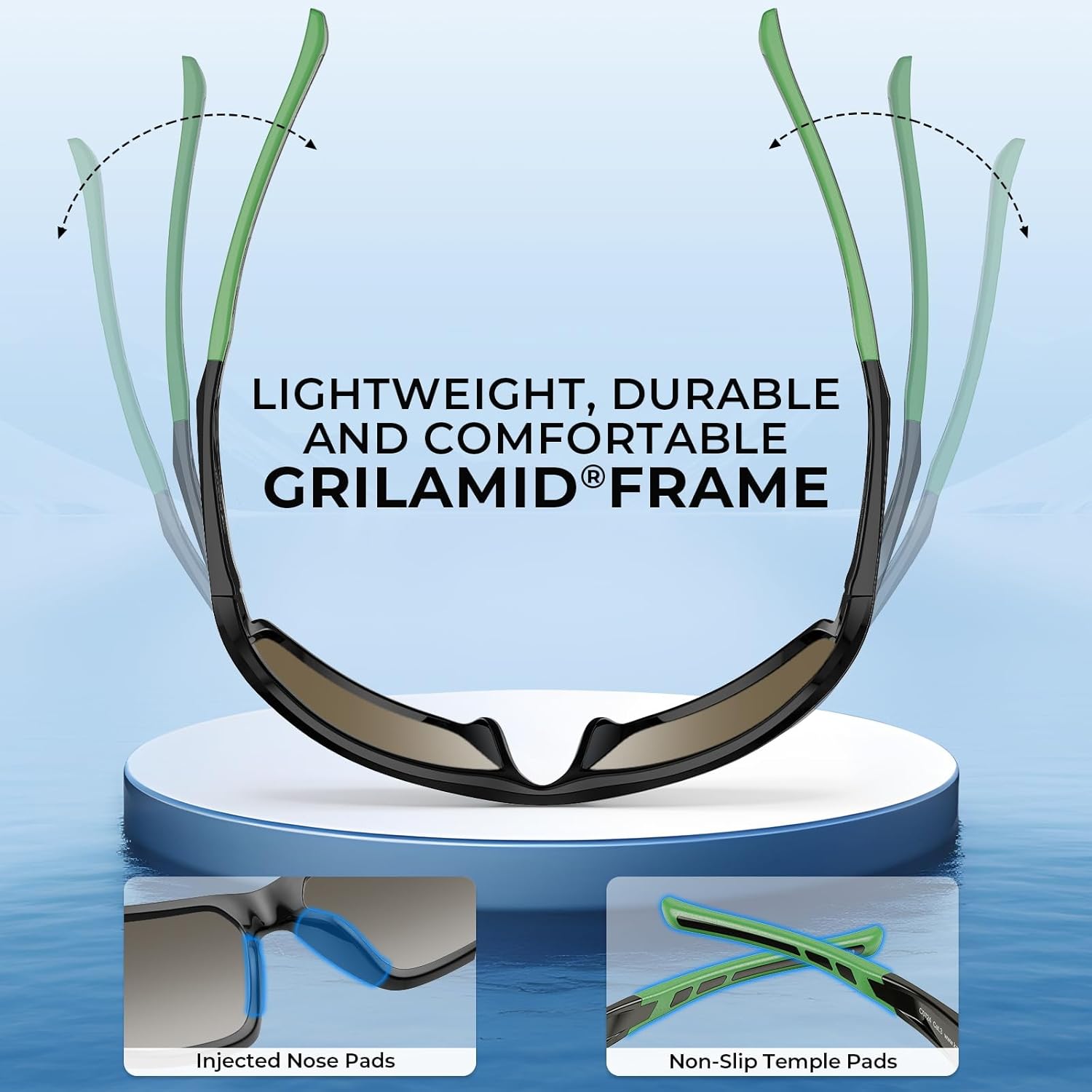 - KEY FEATURES – Impact-resistant polarized 1.0mm TAC lenses reduce glare, Block 100% of harmful UVA and UVB rays, Oleophobic and saltwater resistant lens coatings protect mirror finish, Full wrap frame design, Lightweight, durable, and comfortable Grilamid frames, Non-slip temple pads.
