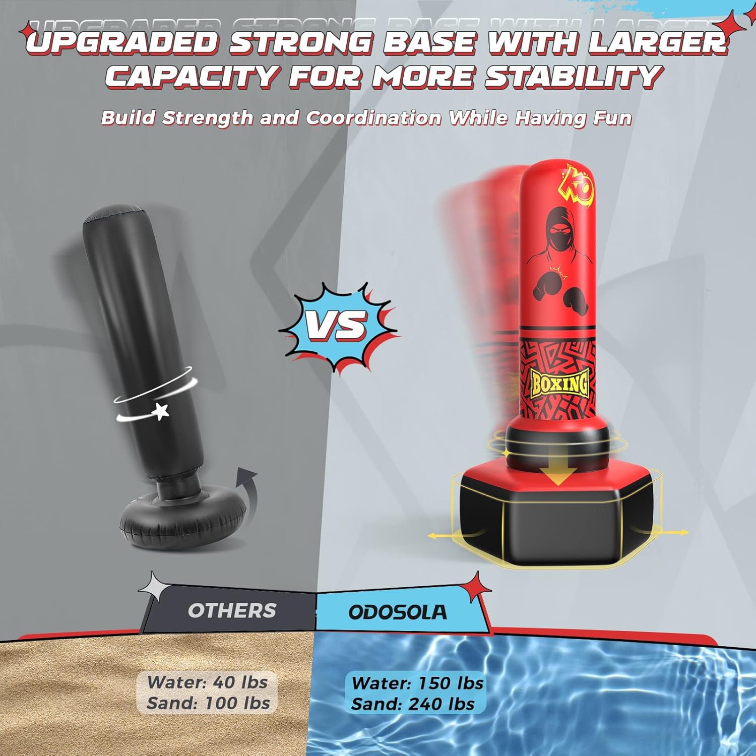 - Stable & Quick Rebound: With an upgraded base that holds up to 240 lbs of sand or 150 lbs of water, this kids punching bag remains stable during play. Its quick rebound ensures it springs back instantly after each hit, keeping kids engaged and active