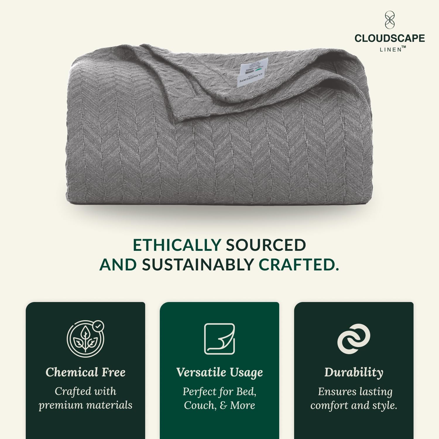Cloud Scape Linen 100% Cotton Queen Size Blanket, Herringbone Pattern, Lightweight Summer Blanket,Best Gifts for Women, fits Full Size Bed, 92 x 92, Dark Grey