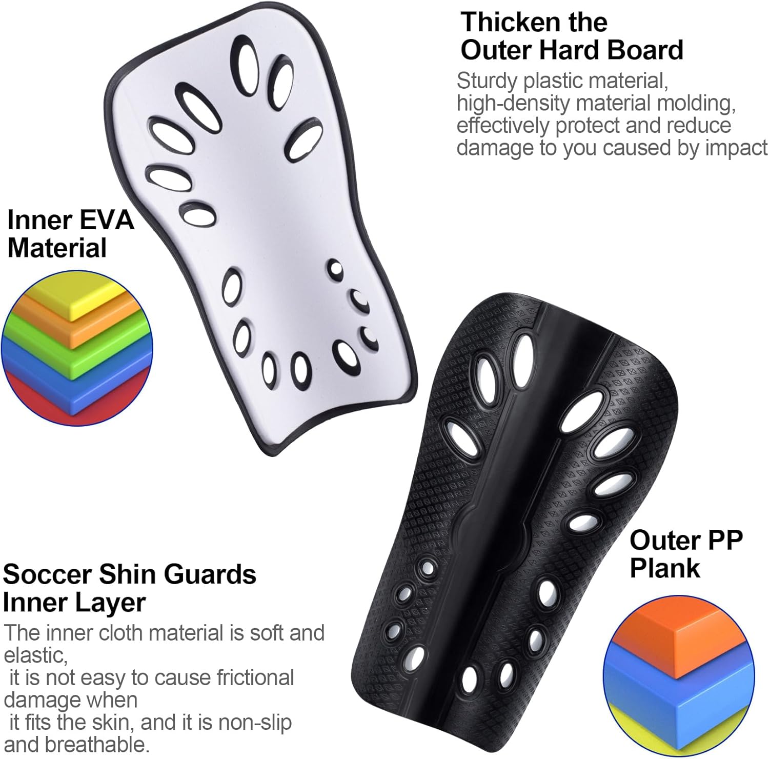 - PREMIUM MATERIAL: This soccer shin guard is made of tough and wear-resistant PP material with high density & highly breathable EVA sponge inside to give you great protection when playing soccer games.