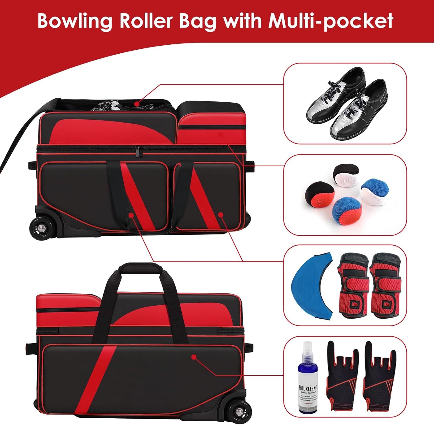 - Multi-pocket to Store Bowling Accessories: The 3 ball bowling bag with wheels has a top compartment for holding one pair of bowling shoes up to men's size 16. Besides, there are many pockets to store bowling accessories, such as gloves, bowling shirts, towels, ball cleaner, shoe brushes, shoe cover, pen and extra slide. It can keep bowling accessories in organized and easy to access