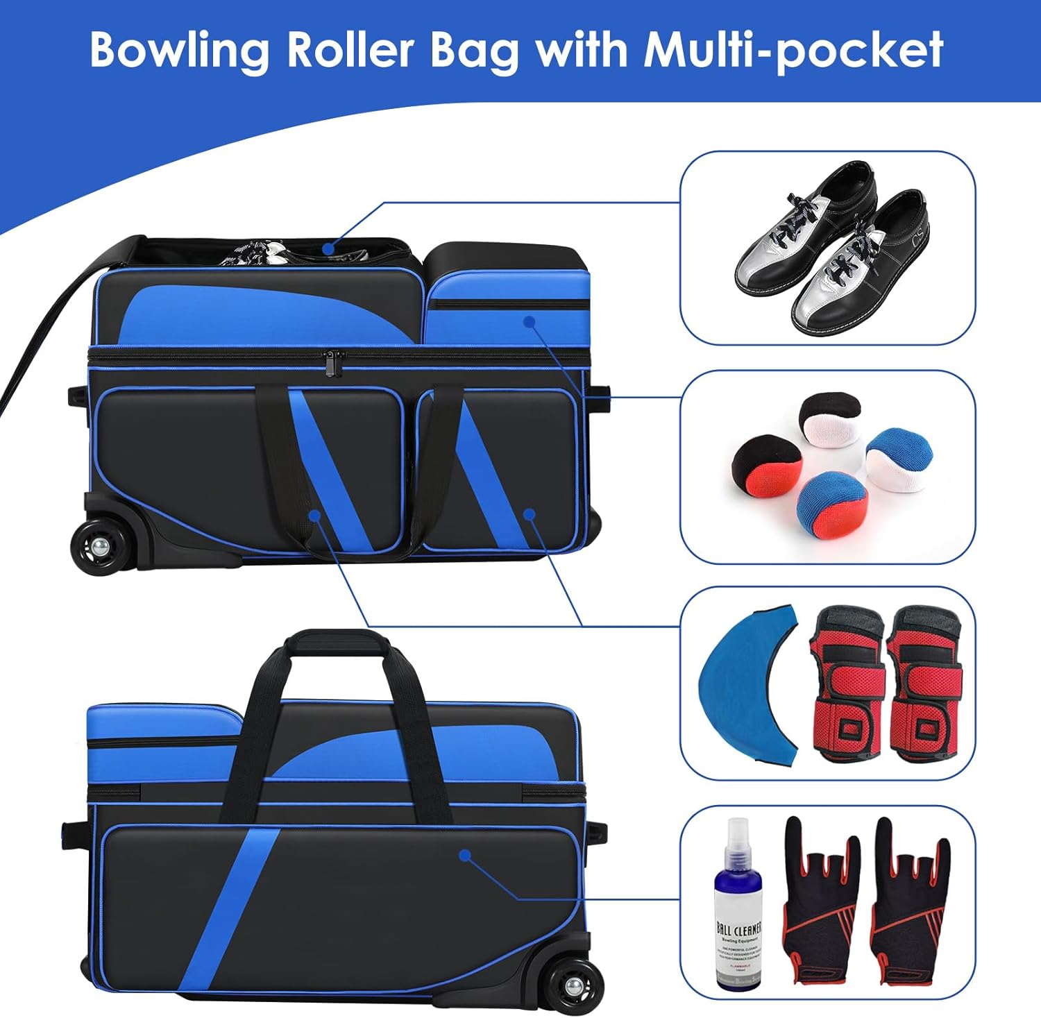 - Multi-pocket to Store Bowling Accessories: The 3 ball bowling bag with wheels has a top compartment for holding one pair of bowling shoes up to men's size 16. Besides, there are many pockets to store bowling accessories, such as gloves, bowling shirts, towels, ball cleaner, shoe brushes, shoe cover, pen and extra slide. It can keep bowling accessories in organized and easy to access