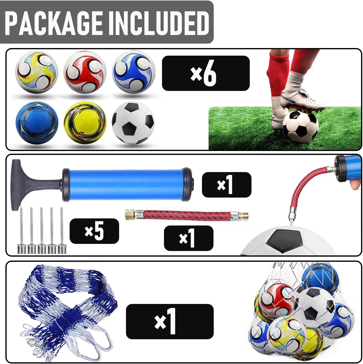 - 【Pack of 6】 Includes 6 official regulation size 5 composite leather soccer balls, 1 pump, and a mesh bag that can hold all the soccer balls.