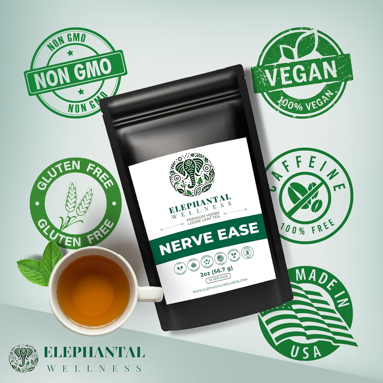 Elephantal Wellness Nerve Ease Herbal Tea | Calming Nervous System Support with Chamomile Tea, Passionflower, Lemon Balm Tea, Valerian & St. John’s Wort | Loose Leaf, Caffeine-Free, 2oz, 20 Servings