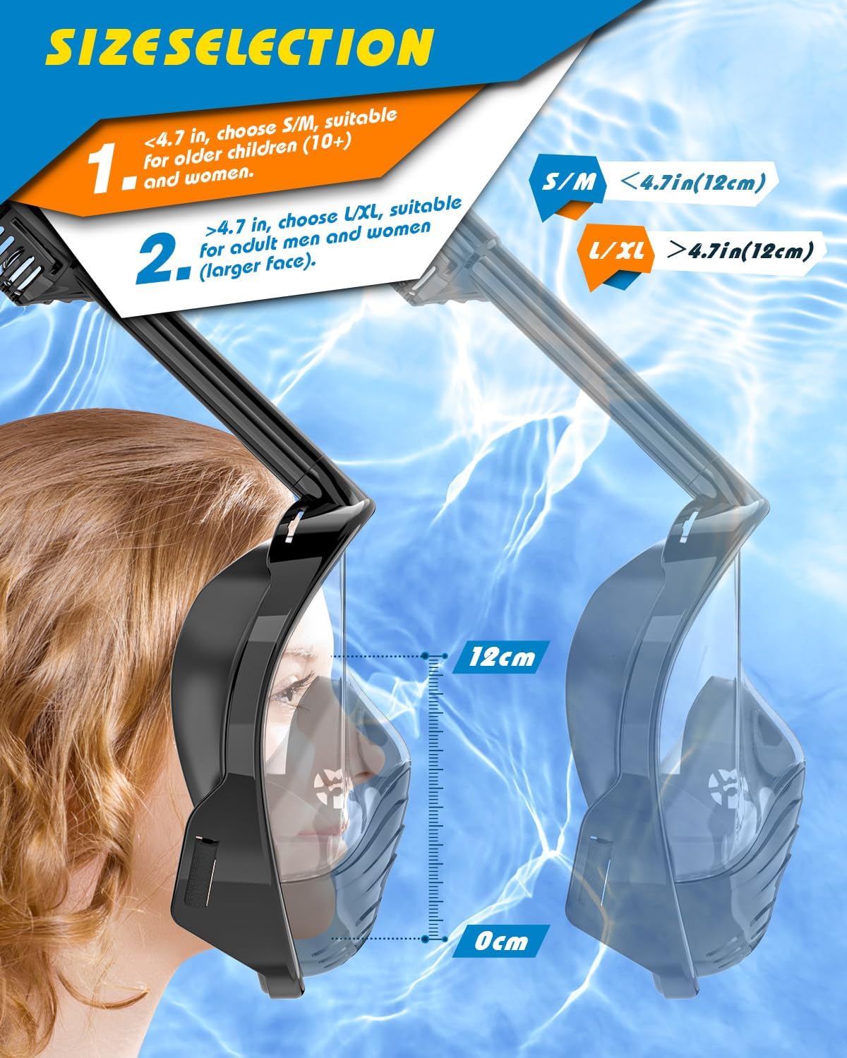 - 【Full Face Snorkel Mask】 Be different from other traditional snorkle gear, our snorkeling mask provides you a 180 degree field of vision, and offers superior views over a standard diving mask and opens up a new world of underwater adventure, full face design allows you to breath comfortably through nose and mouth during snorkeling.