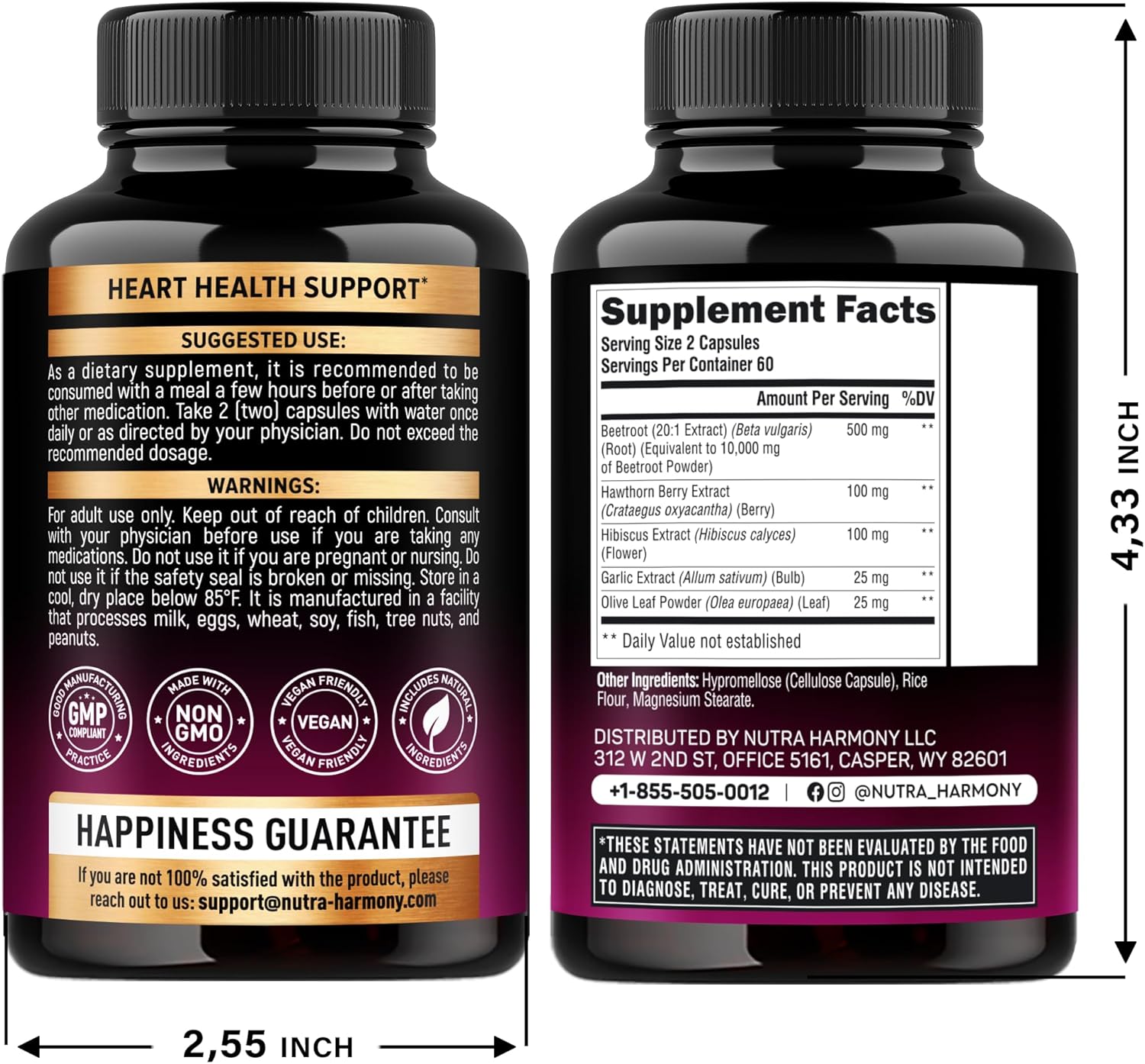 - 5-in-1 Heart Health Support Complex β Supercharged with Hawthorn Berry, Hibiscus, Garlic Extract, and Olive Leaf to enhance Beet Root's effectiveness. These powerful ingredients work together synergically to support healthy circulation & endurance and optimize heart function, helping you feel energized & vital.