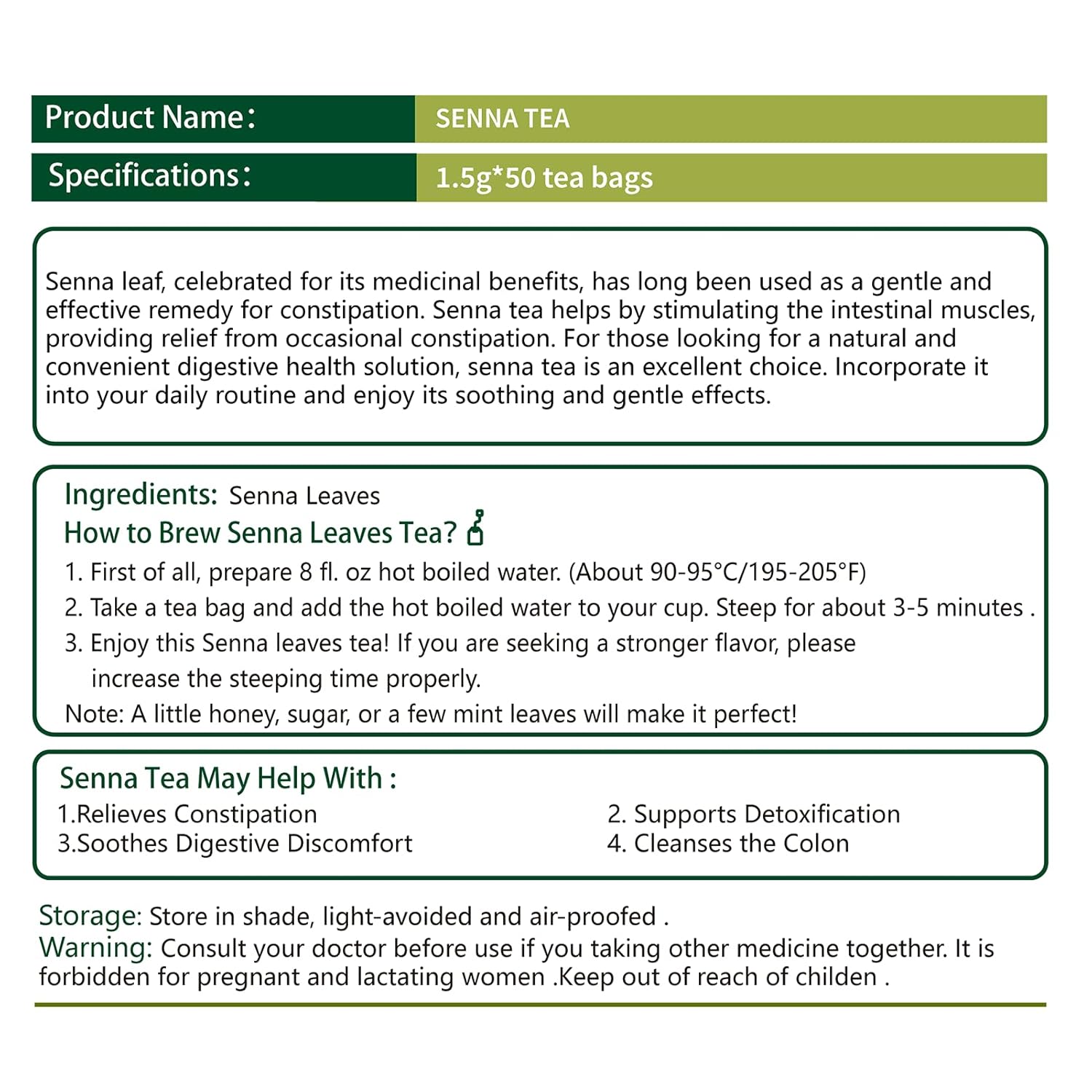 - 【Consumption Guidelines】: Limit senna tea to two cups per day and avoid prolonged use. Be mindful of potential medication interactions, and consult a healthcare professional if pregnant, breastfeeding, a child, elderly, or sensitive to senna leaves