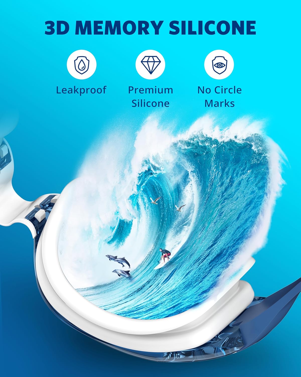 - Great Seal & No Leaking-The ergonomic design of swim goggles with high-quality silicone material ensures a close fit to different face shapes and never allows leakage. In addition, the flexible silicone frame and improved higher nose rest provide extreme comfort and will never hurt your nose or leave marks on your face.