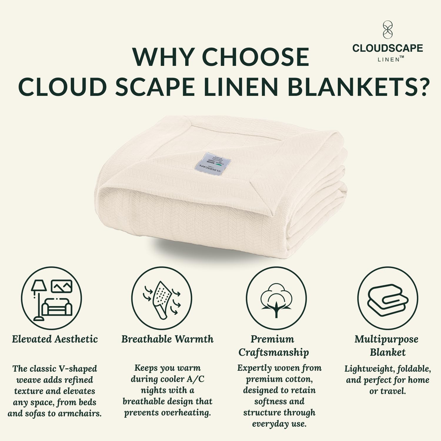 Cloud Scape Linen Herringbone Cotton Throw Blanket for Couch, Bed,Sofa, Home Decor, Soft, Lightweight, All-Season Bed Blanket, 50 x 70, Ivory