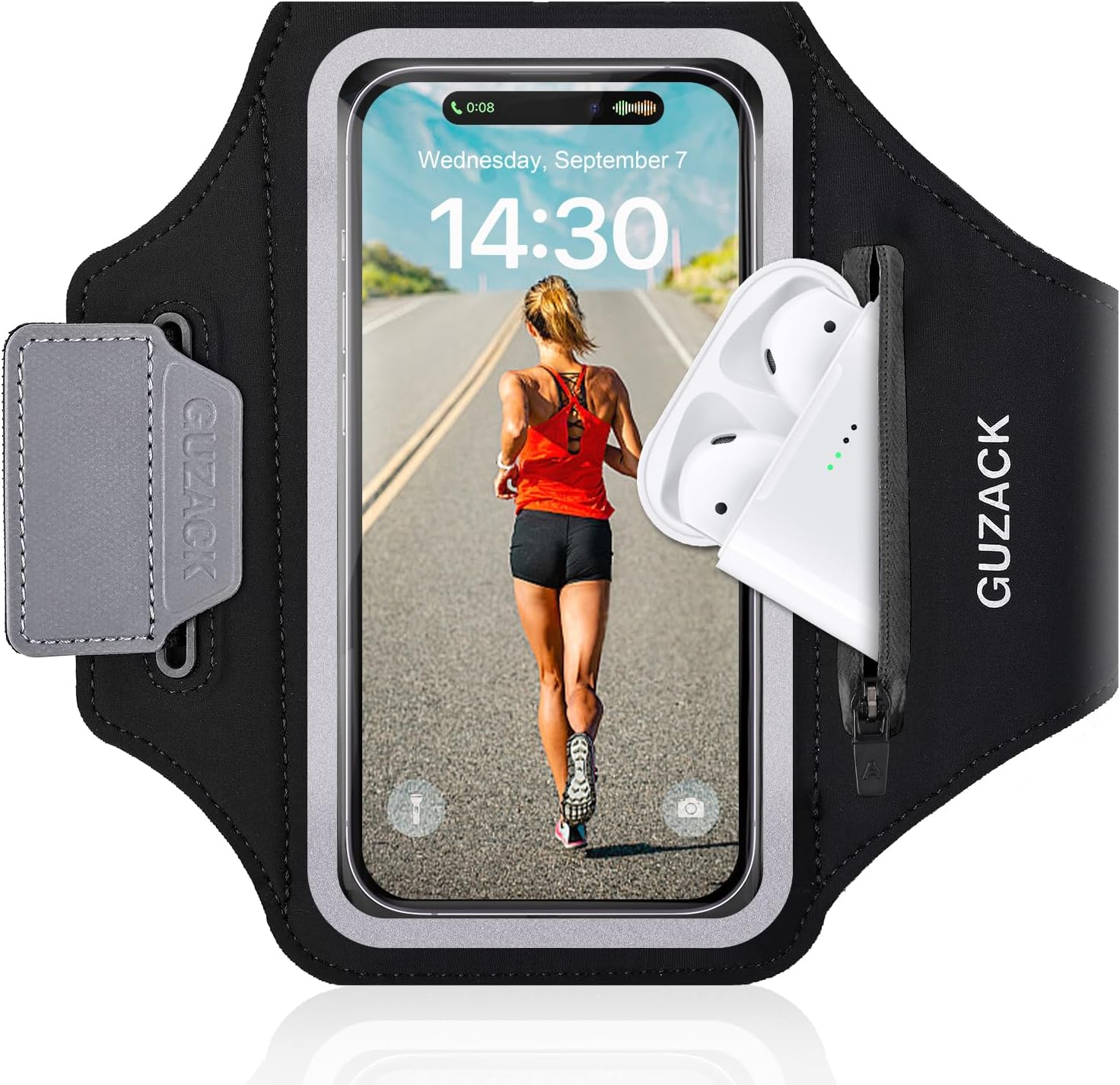 GUZACK Running Phone Holder with Zipper Pouch, Running Armband for iPhone 16 Pro/15/14/13/12/11 Pro Max/Plus/XR/XS, Galaxy S25/S24/S23/S22, Cell Phone Arm Holder with Card Slot - Size S