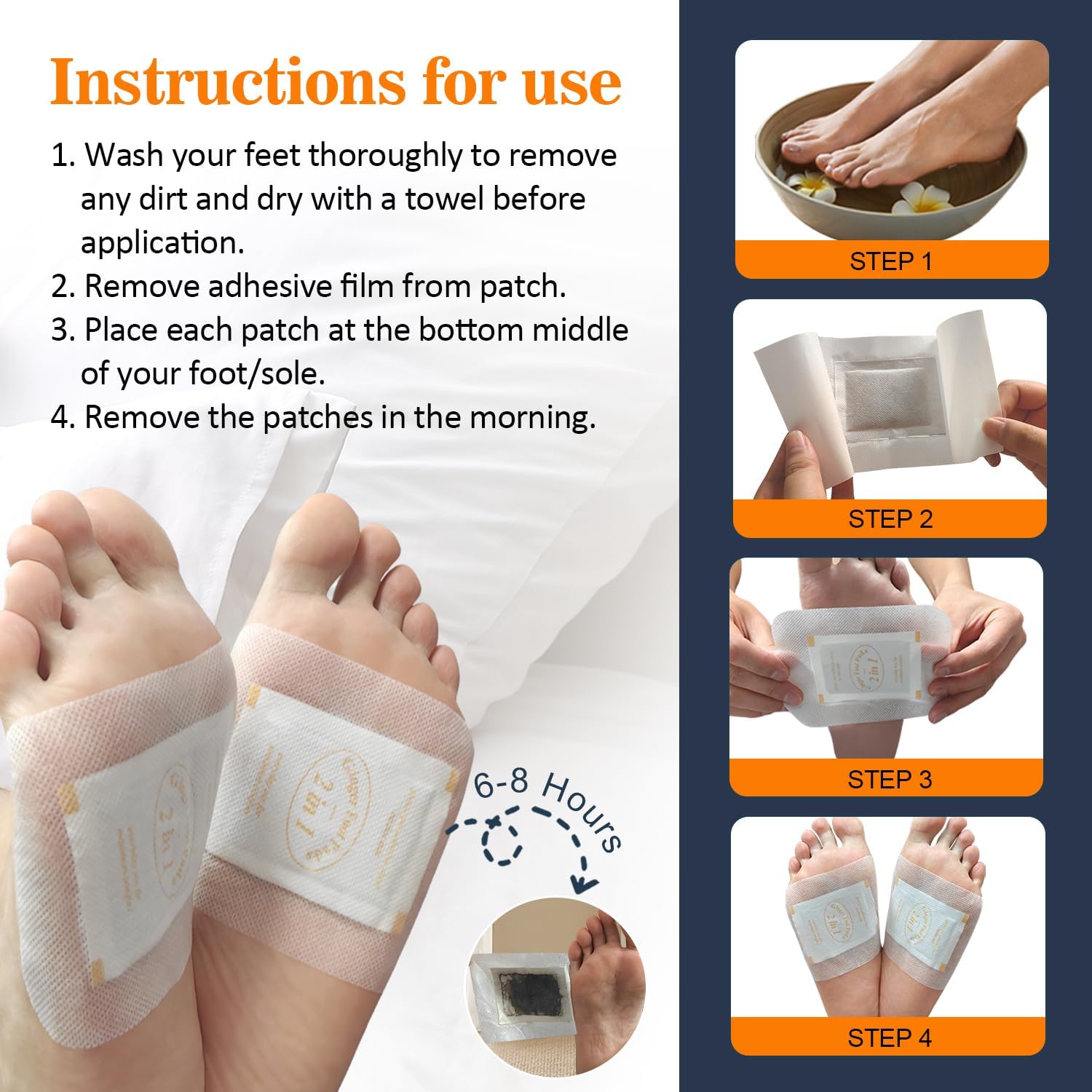 - 2. EASY TO USE: Clean both feet with warm water and let them dry; Take out one pad, and peel off the adhesive sheet;Stick foot pad to the sole of the bottom middle of your foot;Finally, remove and discard after 6-8 hours