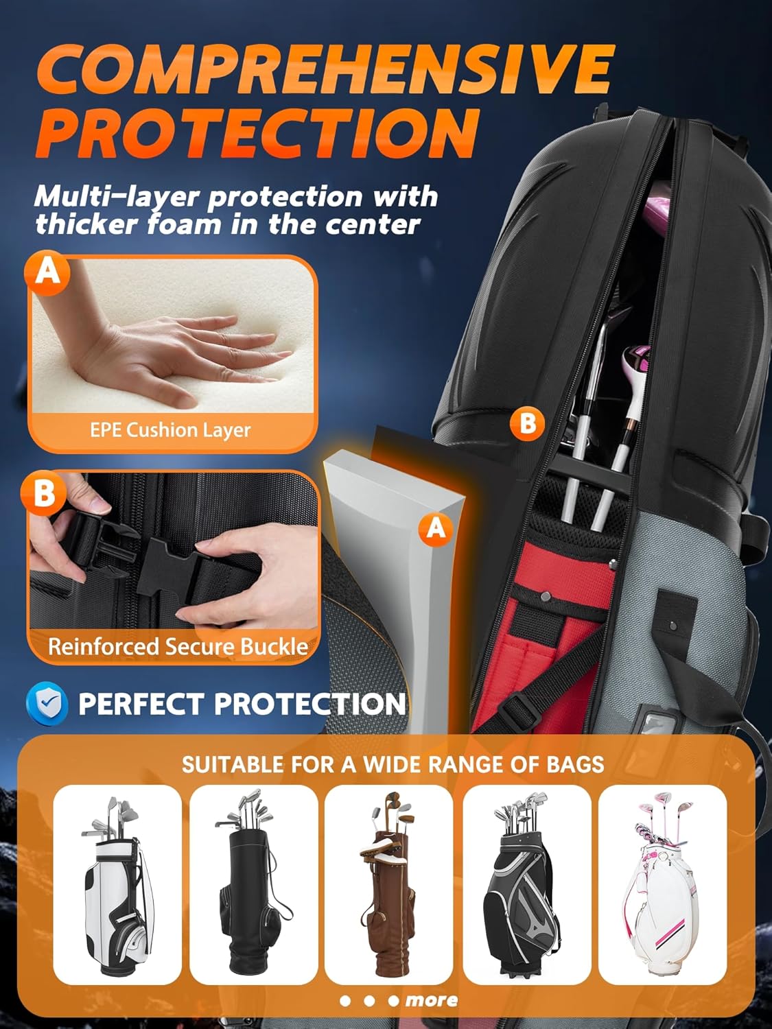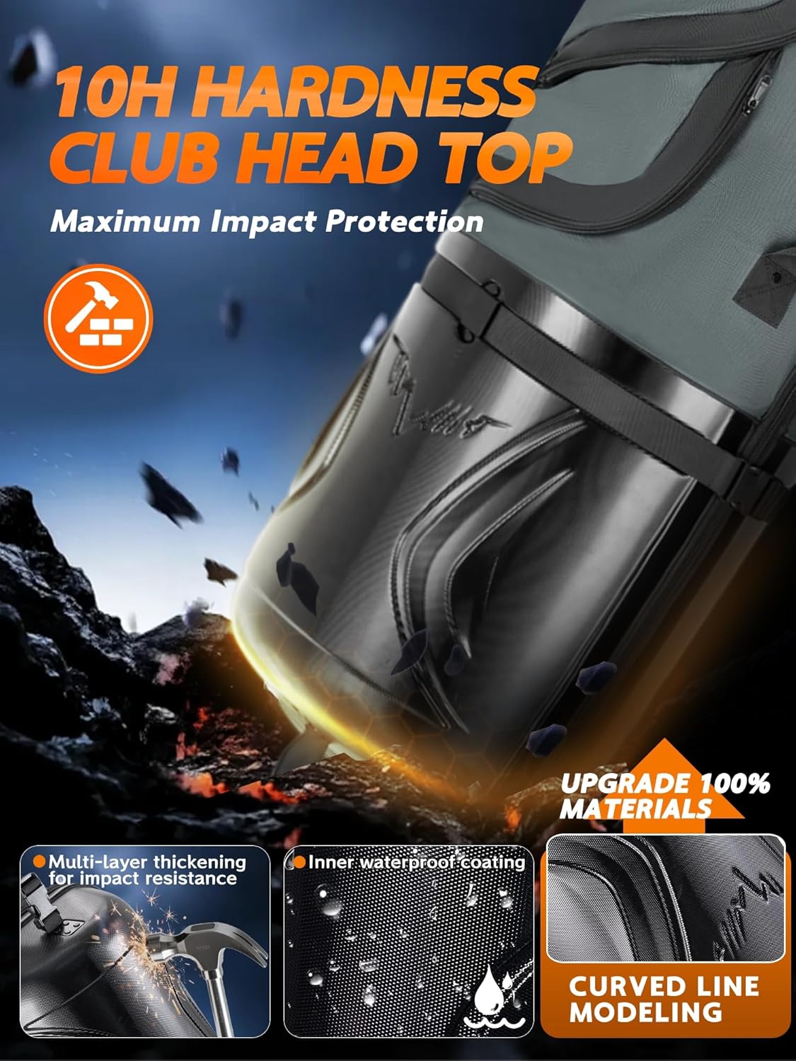 - 【Semi-Hard Shell Protection】: Our golf travel bag constructed from high-strength hard shell PC top, which effectively protect your golf clubs from collision and damage during travel. Soft and durable 1680D waterproof Oxford fabric body, protect your equipment from rain and moisture