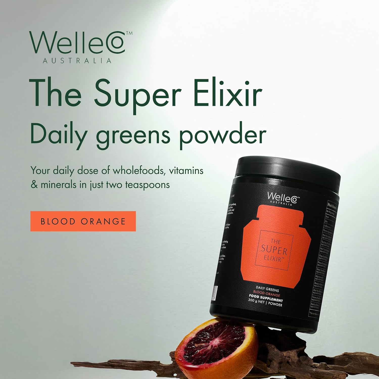 WelleCo The Super Elixir Daily Greens Powder, Probiotic Drink Mix with Whole Foods, Gluten Free, Vegan Gut Health Powder, Energy, Immunity, Healthy Skin, Hair & Nails (Jar, Blood Orange)