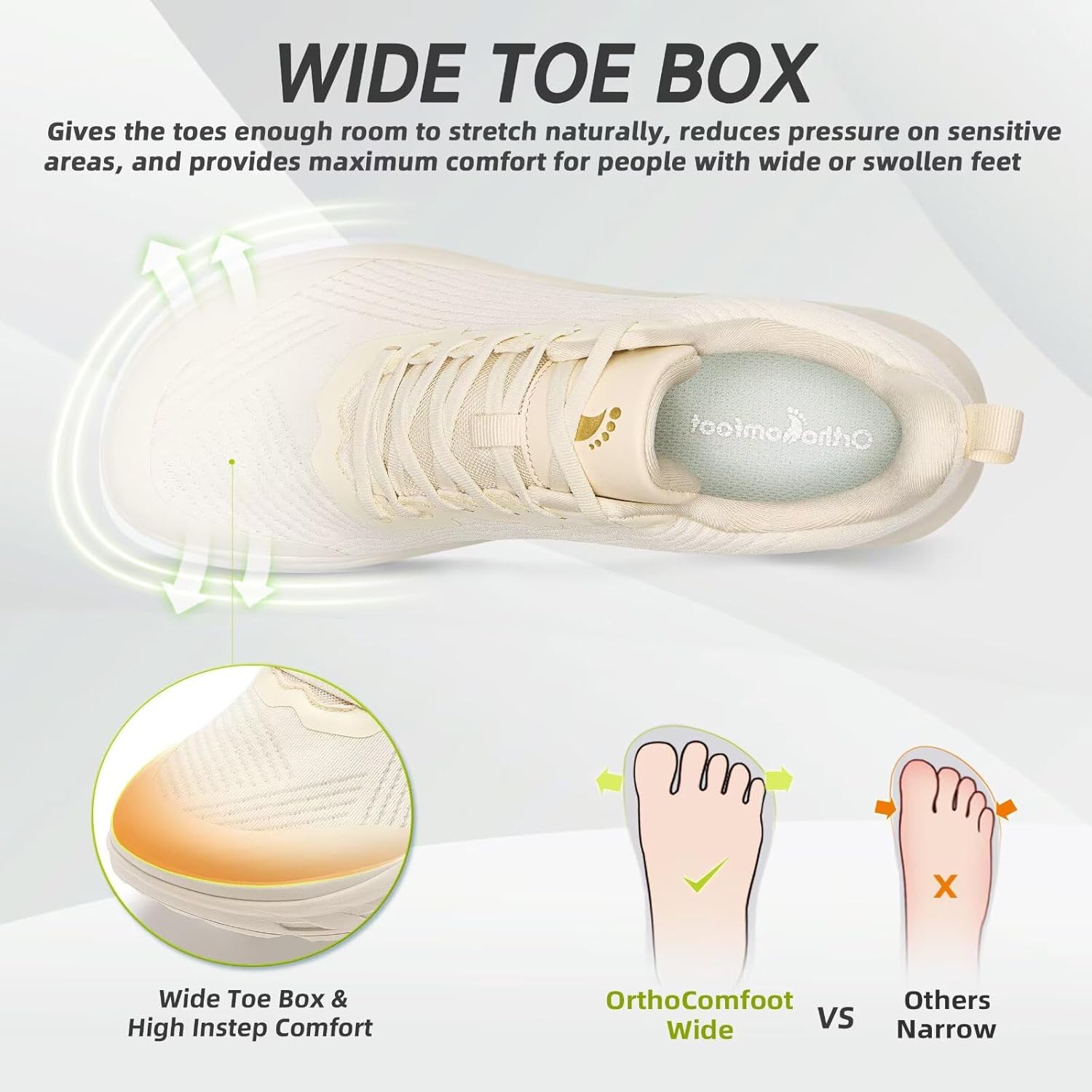 - Wide Toe Box: OrthoComfoot diabetes shoes, Experience your toes freedom of movement. Feel comfy with ample toe space. It can tolerate various problems caused by foot problems. It is particularly suitable for people with wide or swollen feet, as well as those with foot problems such as edema, toe eversion, flat feet, bunions, and hammer toes.