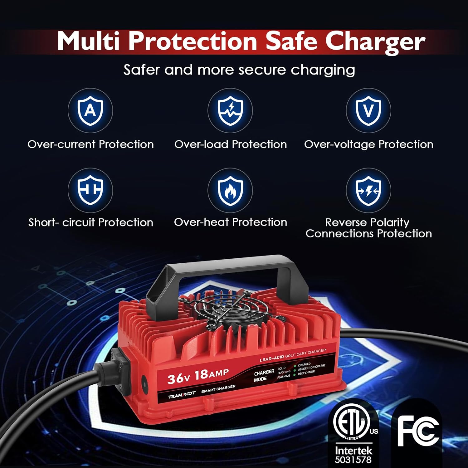- 【Multiple Security Protections & Certifications】ETL & FCC certified for guaranteed safety, this 36v ezgo golf cart charger features six-layer protection against over-current, over-voltage, overheating, overload, short-circuit, and reverse polarity—delivering worry-free charging you can trust