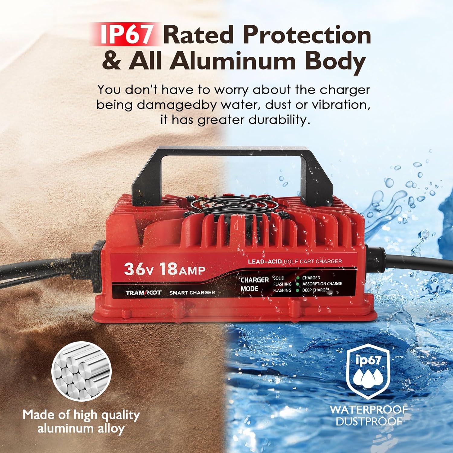 - 【18 Amp Smart Charging/Lead Acid】TRAMROOT golf cart charger is designed for 36 volt EZGO TXT golf cart with D style plug, plug-and-play, fast and efficient. Built-in smart trickle charge technology, when charging is complete, the charger automatically shuts off and goes into trickle mode to keep the battery at peak performance