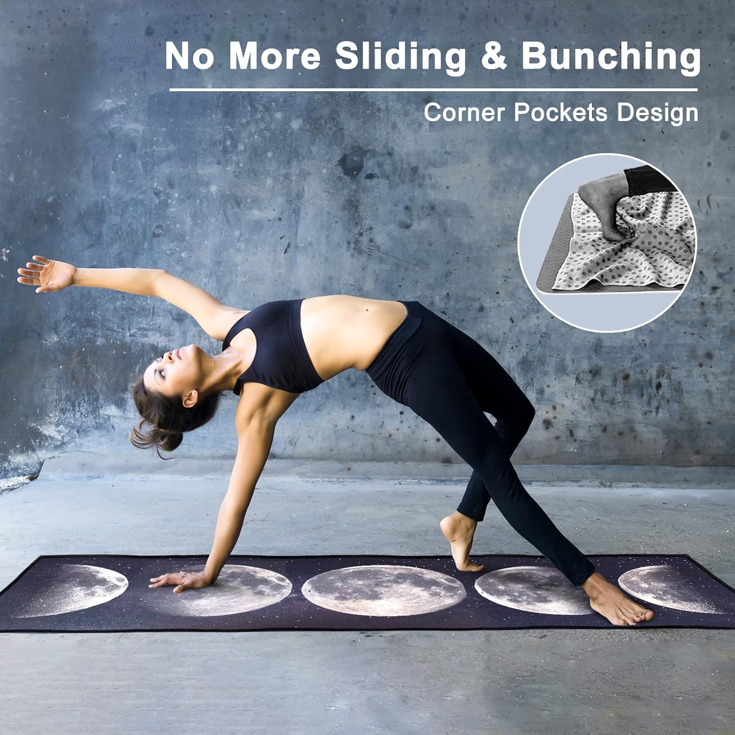 QiyI Yoga Mat Towel with Corner Pockets, Non Slip Sweat Absorbent Hot Yoga Towels, Soft Yoga Blankets with Travel Bag, Skidless Mat Cover for Workout, Gym, Fitness - 74"x26", Moon Cycle