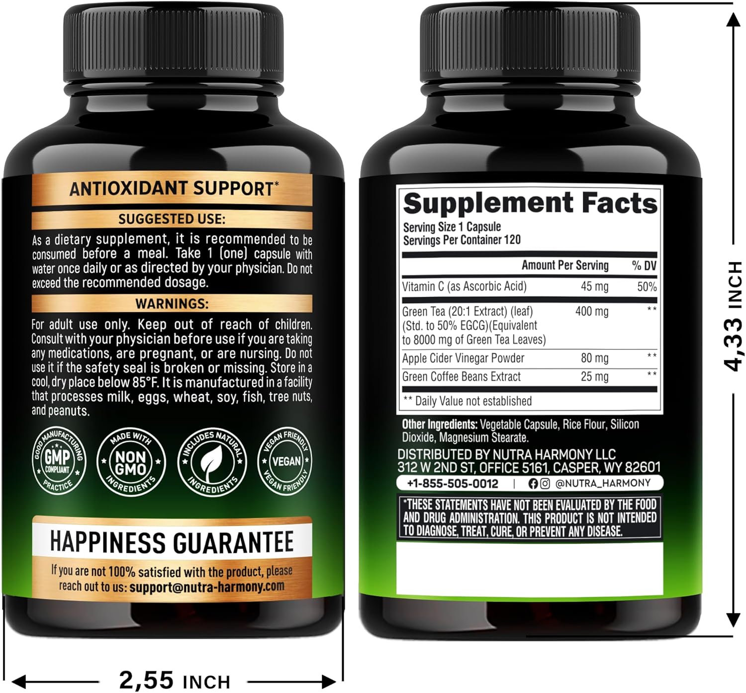 - Natural Antioxidants Complex — Packed with natural antioxidants Apple Cider Vinegar (ACV), Green Coffee Beans & Vitamin C, our Green Tea capsules help harness the power of herbs to support antioxidant protection, metabolic & digestive health, detoxification, and contribution to overall vitality.