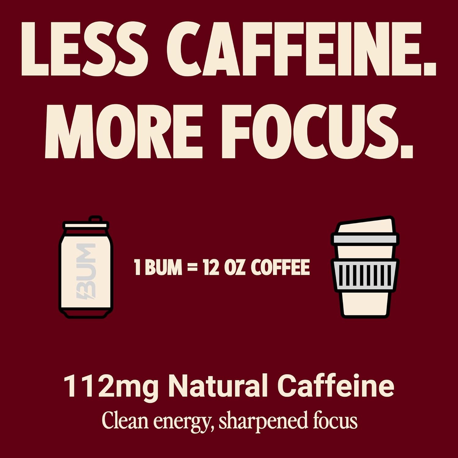 - Keep It Clean: Leave the drinks that contain a laundry list of ingredients in the past. Bum Energy contains just two simple ingredients, 112mg of Caffeine & 250mg of Cognizin. Made with zero sugar and no artificial colors, every sip unlocks pure, untapped potential.