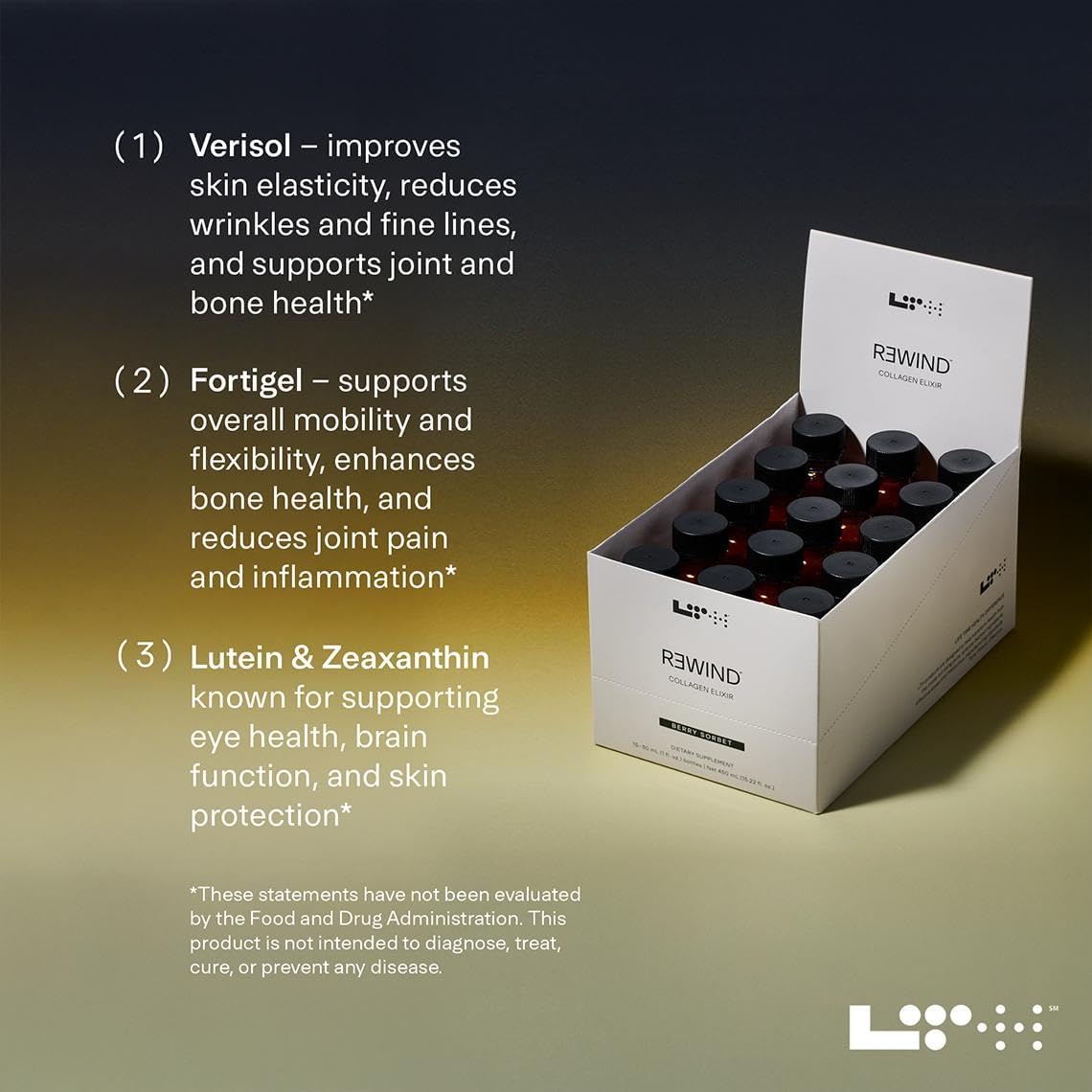 - Why You'll Love It: Rewind Collagen Elixir is a berry-sorbet flavored daily shot that supports your skin, hair, bone and joint health; it's an easy way to elevate both beauty and confidence*