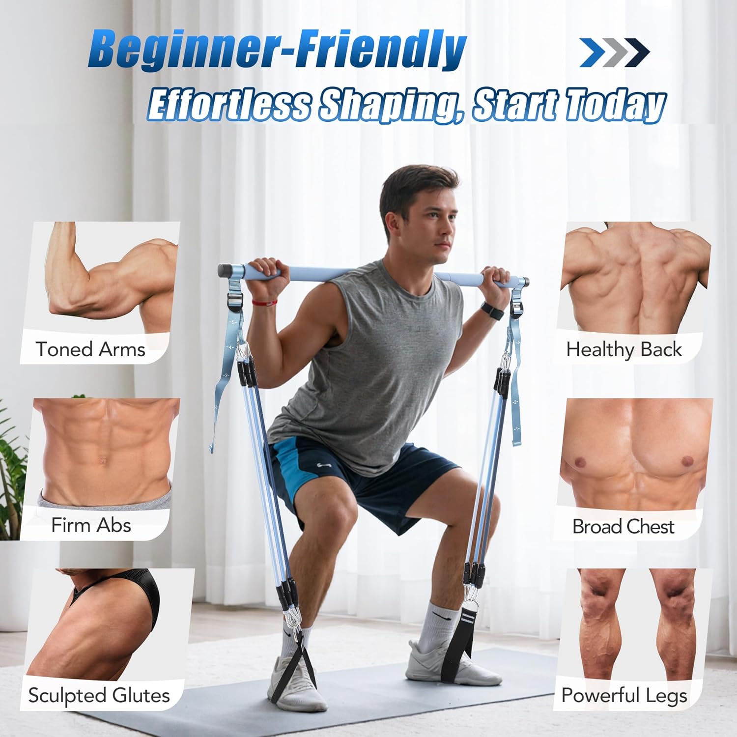 - 【Stylish & Durable | Family-Friendly Fitness】The Pilates bar set flaunt sleek, modern color accents while enjoying industrial-grade steel pipes and Natural latex tube built to last. Lightweight yet sturdy, it’s ideal for busy lifestyles—squeeze in a workout during TV time or office breaks! Moms, athletes, and seniors alike will love its effortless setup and space-saving storage.