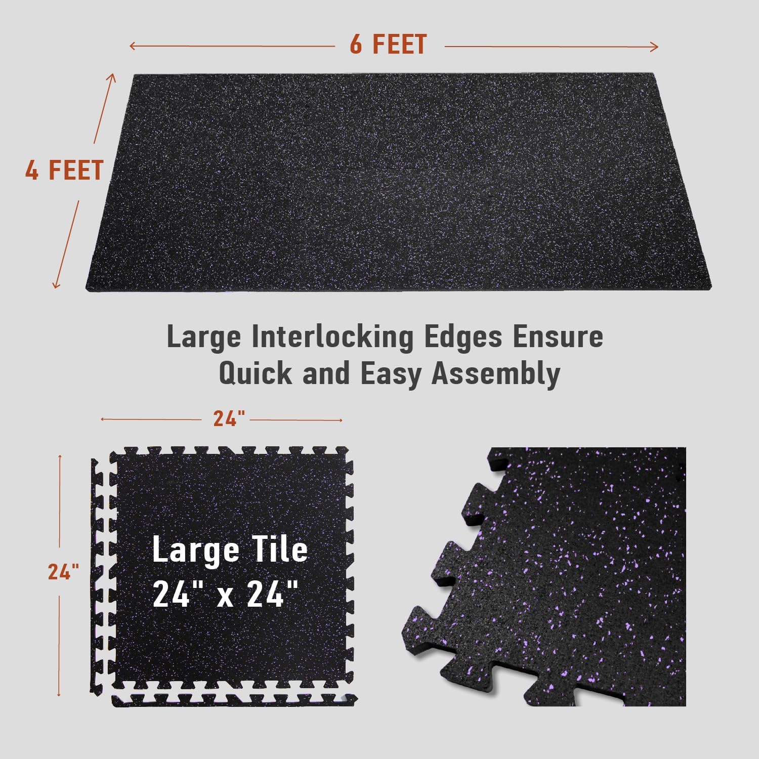- [Easy to Assemble and Detach]: 6 tiles (24" x 24" x 0.56" each), covers 24 sq ft (6 Γ 4 ft). Upgraded larger interlocking locks provide a secure fit, preventing any separation during use, ensuring you can work out without concerns of shifting. Simple assembly and detachment make it effortless to set up your home gym.