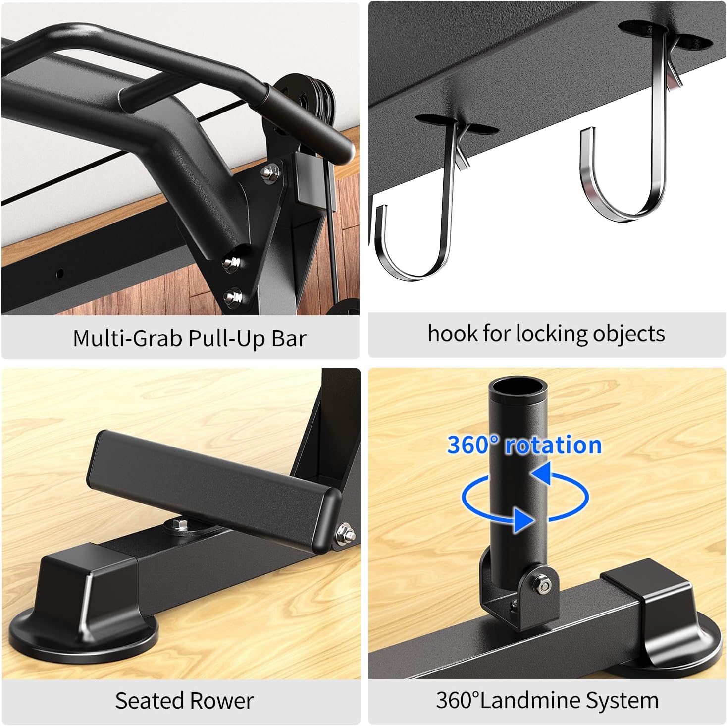 - L02 power cage, equipped with a 360-degree adjustable Landmine Attachment, has a squat rack and the functions of single parallel bars and barbells and pull-ups and cable crossing systems to help you work out your whole body, it can help you do a full body workout at home, sculpting the muscles of the arms, shoulders, back, hips, chest and abdomen.