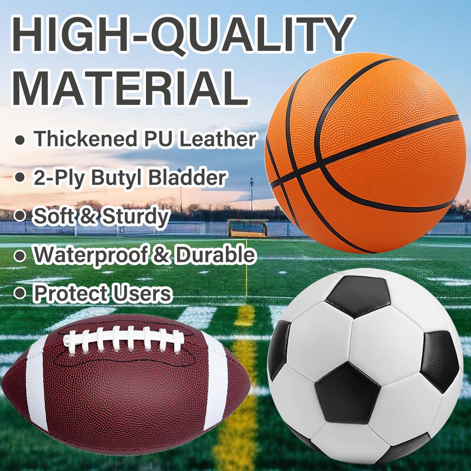- 【Official Size】Size 5 Basketball (27.5" perimeter), Size 4 Soccer Ball (7.87"), Size 6 Football (10" length, 18" circumference)
