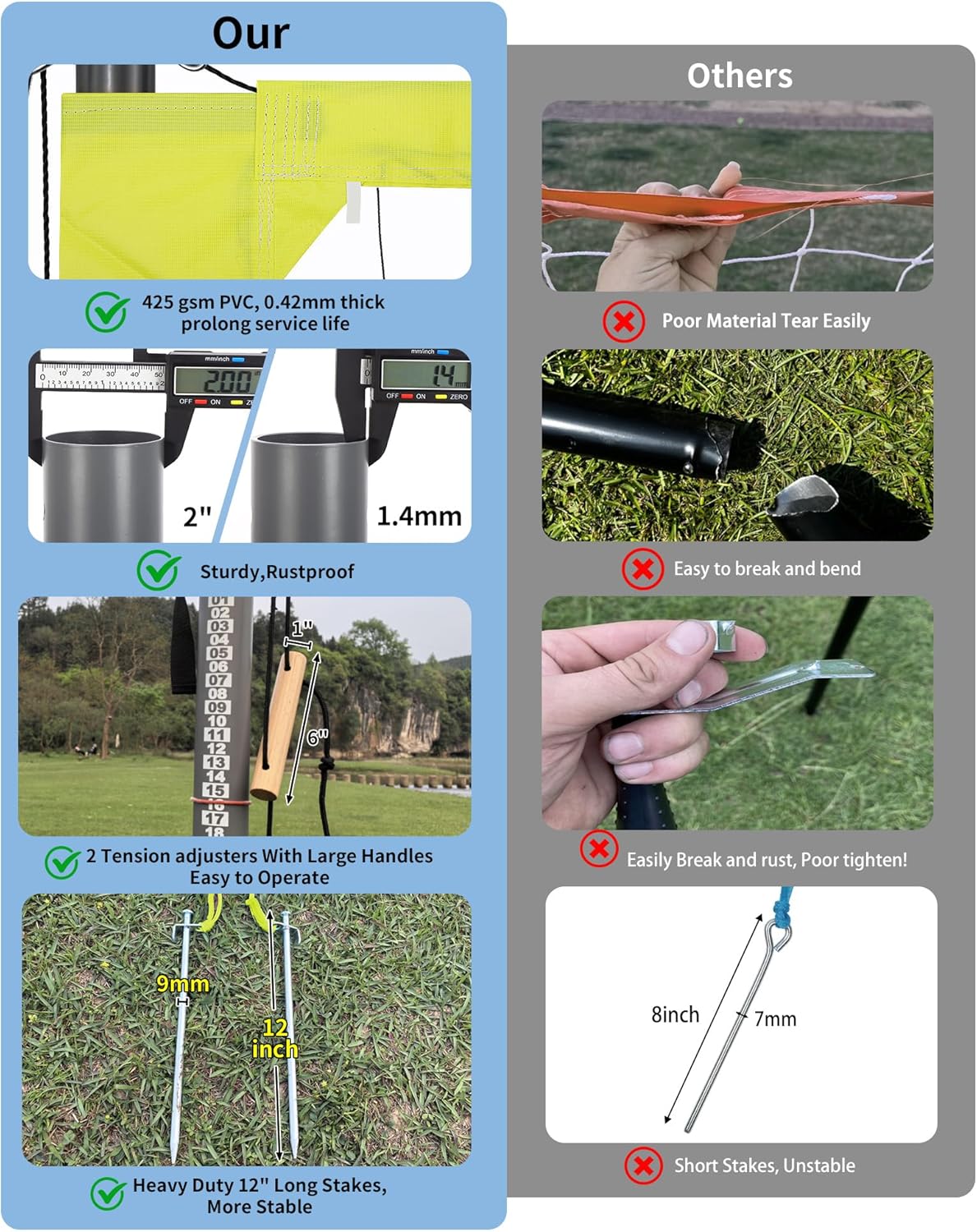 - ๐๐ง๐ฆ๐๐ญ๐๐ก๐๐ ๐๐ฎ๐๐ฅ๐ข๐ญ๐ฒ ๐ฏ๐ฌ. ๐๐ญ๐ก๐๐ซ๐ฌ:Our volleyball net set outshines rivals in every way. The 425 gsm PVC net (0.42mm thick) resists tearing, unlike flimsy others nets. Sturdy 2โ aluminum poles (1.4mm thick) wonโt bend/break, while others use weak, rust - prone materials. Large - handled tension adjusters and 12โ stakes ensure easy setup and stability โ no more unstable short stakes or hard - to - tighten ropes.