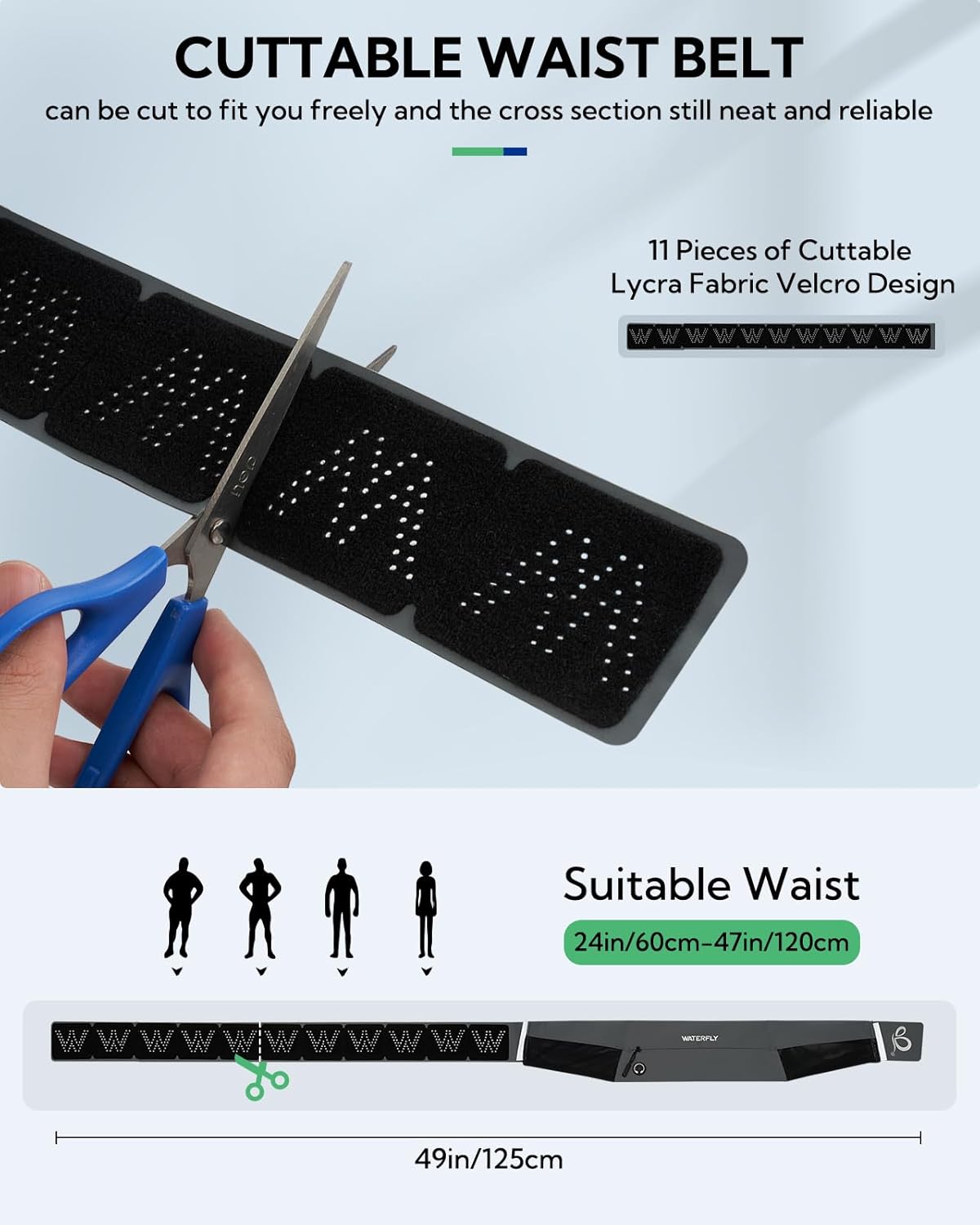- Hook and Loop Tape Design: The running belt can be cut to fit 24-47in waist size freely, the strong adhesion hook and loop tape used in this running belt for adjustment, ensuring it stays close to the body during running