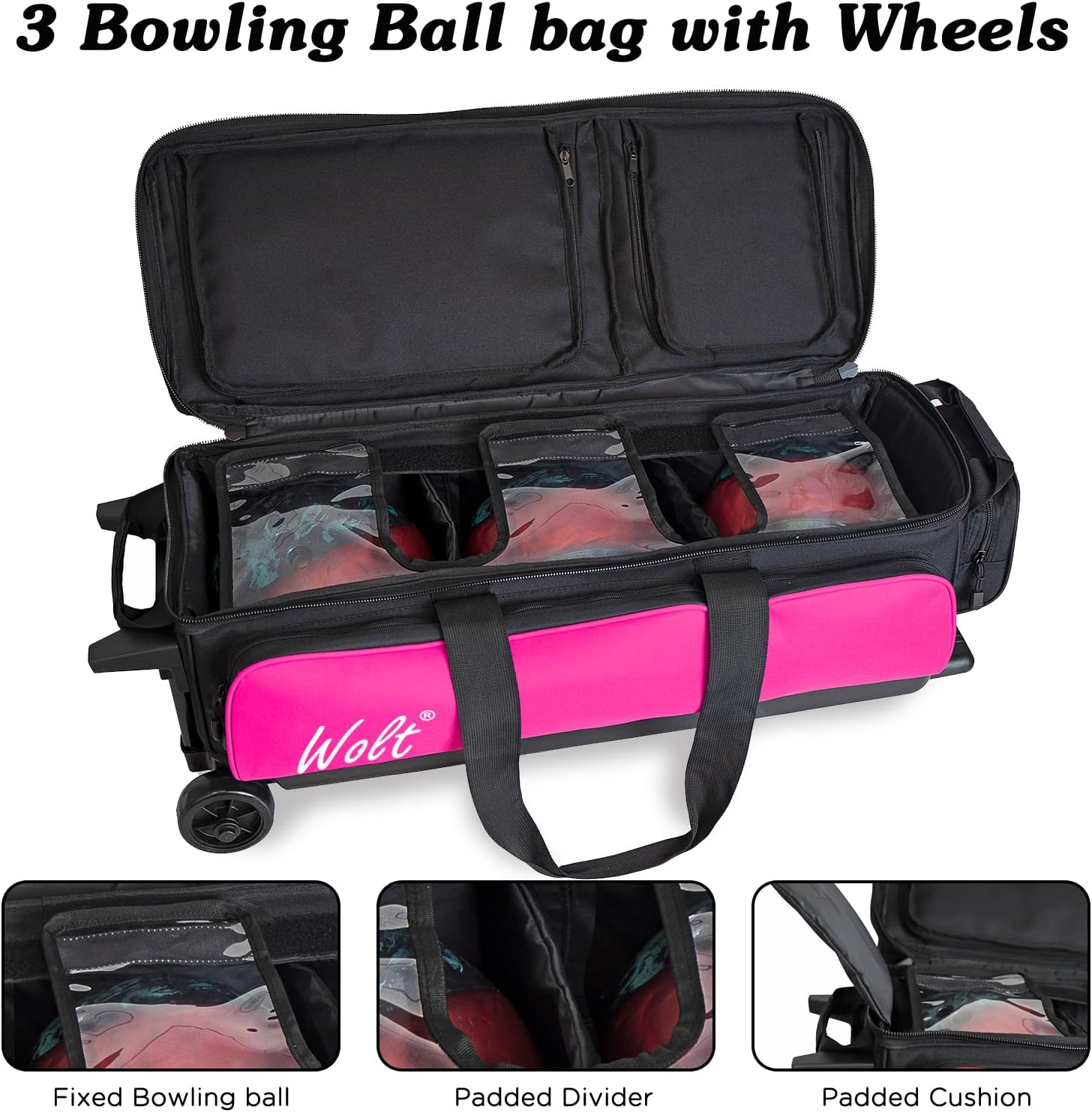 WOLT 3 Ball Bowling Bags with Wheels,Bowling Ball Bag 3 Ball Roller with Separate Shoe Compartment and Accessory Pocket, Retractable Handle Extends to 38’’