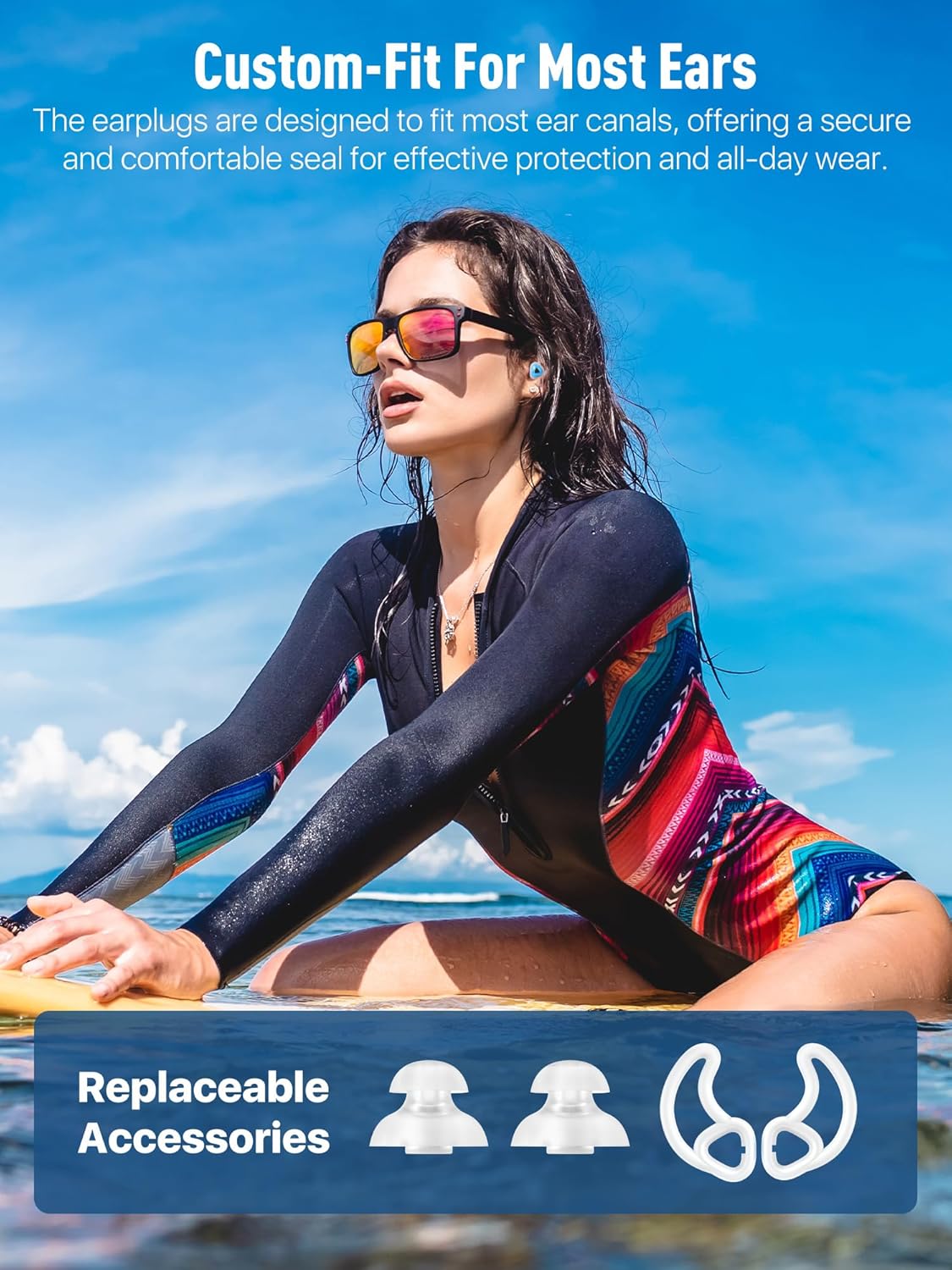 - Secure and Adjustable Fit: Featuring ergonomic wings and customizable ear tips (S, M, L), these earplugs provide a snug, personalized fit for most ear sizes. The adjustable connecting cord and clasp keep them securely in place, even during intense water activities, and prevent loss.