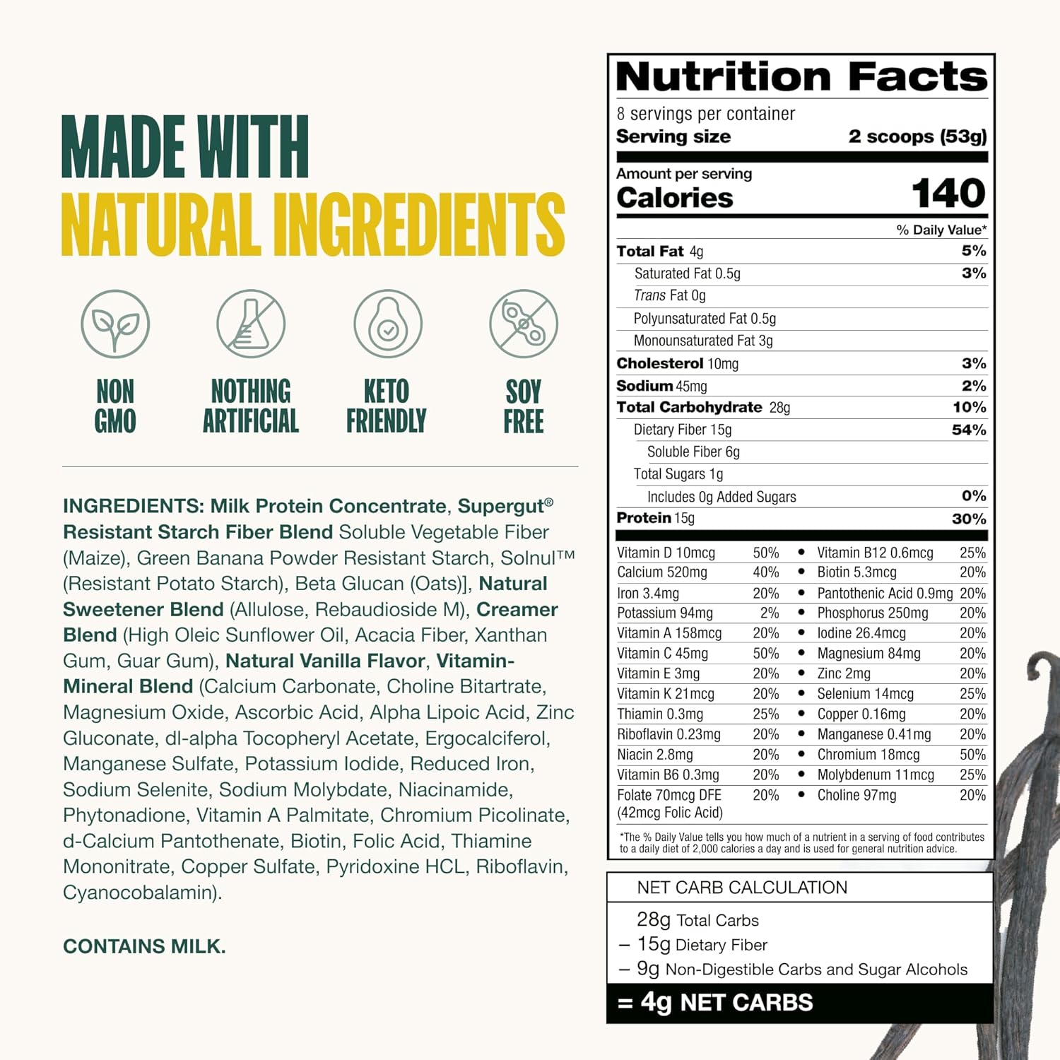 - Gut Goodness in Each Shake: Hit your appetite's off switch with Supergut’s Gut Healthy Prebiotic Shake. Each delicious shake is packed with 15 grams of prebiotic fiber, 15 grams of protein, 4 grams of net carbs, and 1 gram of sugar. It supports a healthy gut while helping you feel nourished and satisfied for longer. Vanilla flavor.