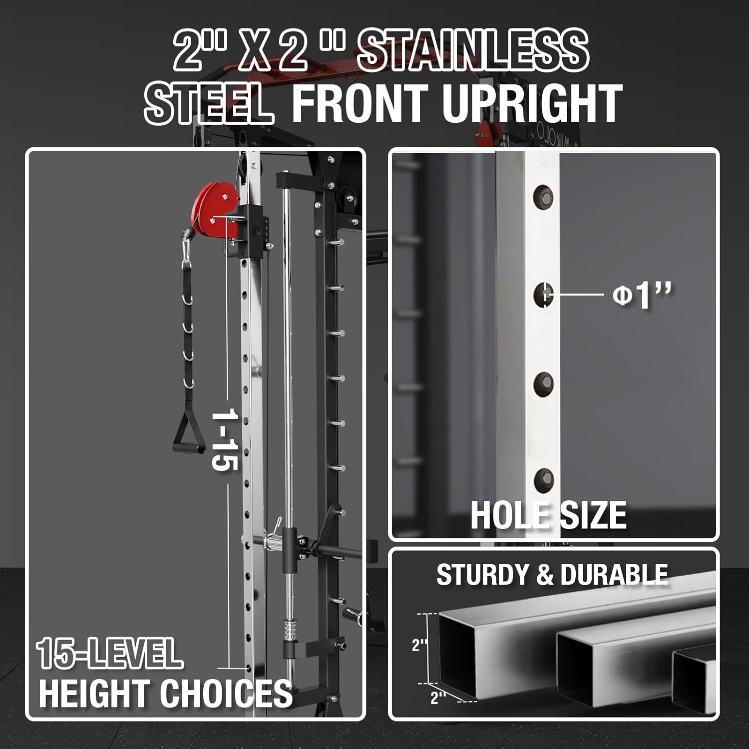 - [Build Your Dream Home Gym] One machine can meet your various needs. M4 is designed for trainers. It is combines power cage, smith machine, cable crossover machine, cable station, and pull-up station. Lets you do unlimited exercises in a limited space! Pre-reserved holes for resistance band, you can do more weight training and resistance exercise. Such as resistance (pull-ups, barbell squats, shoulder presses, cable chest fly, etc.)