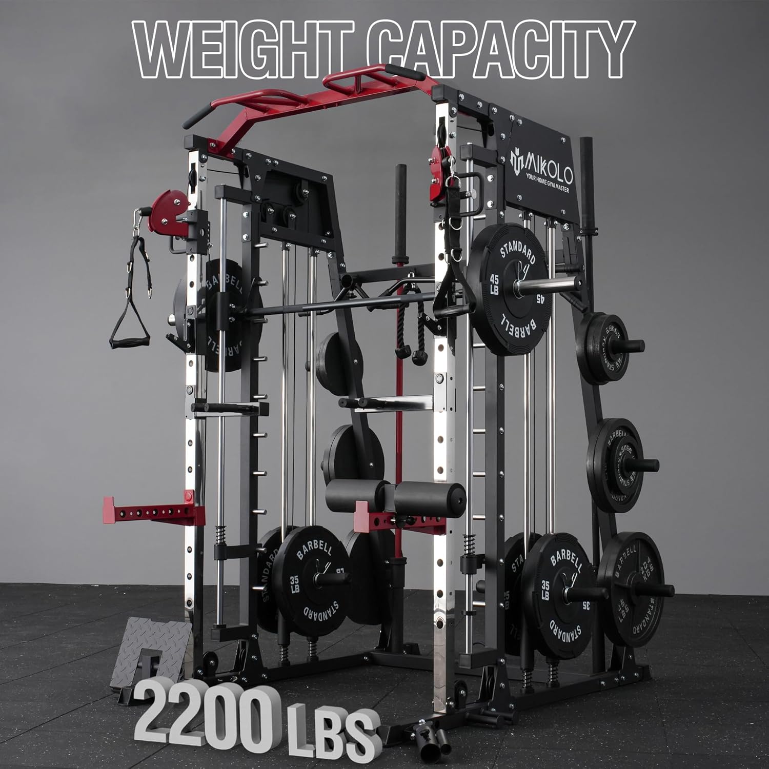 Mikolo Smith Machine, 2200lbs Squat Rack with LAT-Pull Down System & Cable Crossover Machine, Training Equipment with Leg Hold-Down Attachment