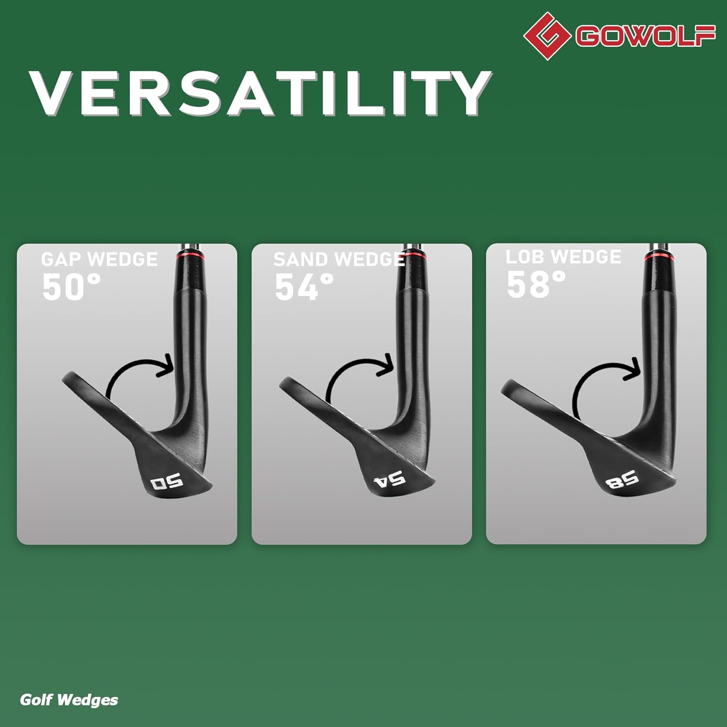 - 【Superior Forgiveness】Gowolf Gap Wedge, Sand Wedge and Lob Wedge are designed with a leading edge that prevents digging into the ground, ensuring forgiveness even on mishits. This feature helps eliminate fat shots and allows for more consistent and accurate swing.